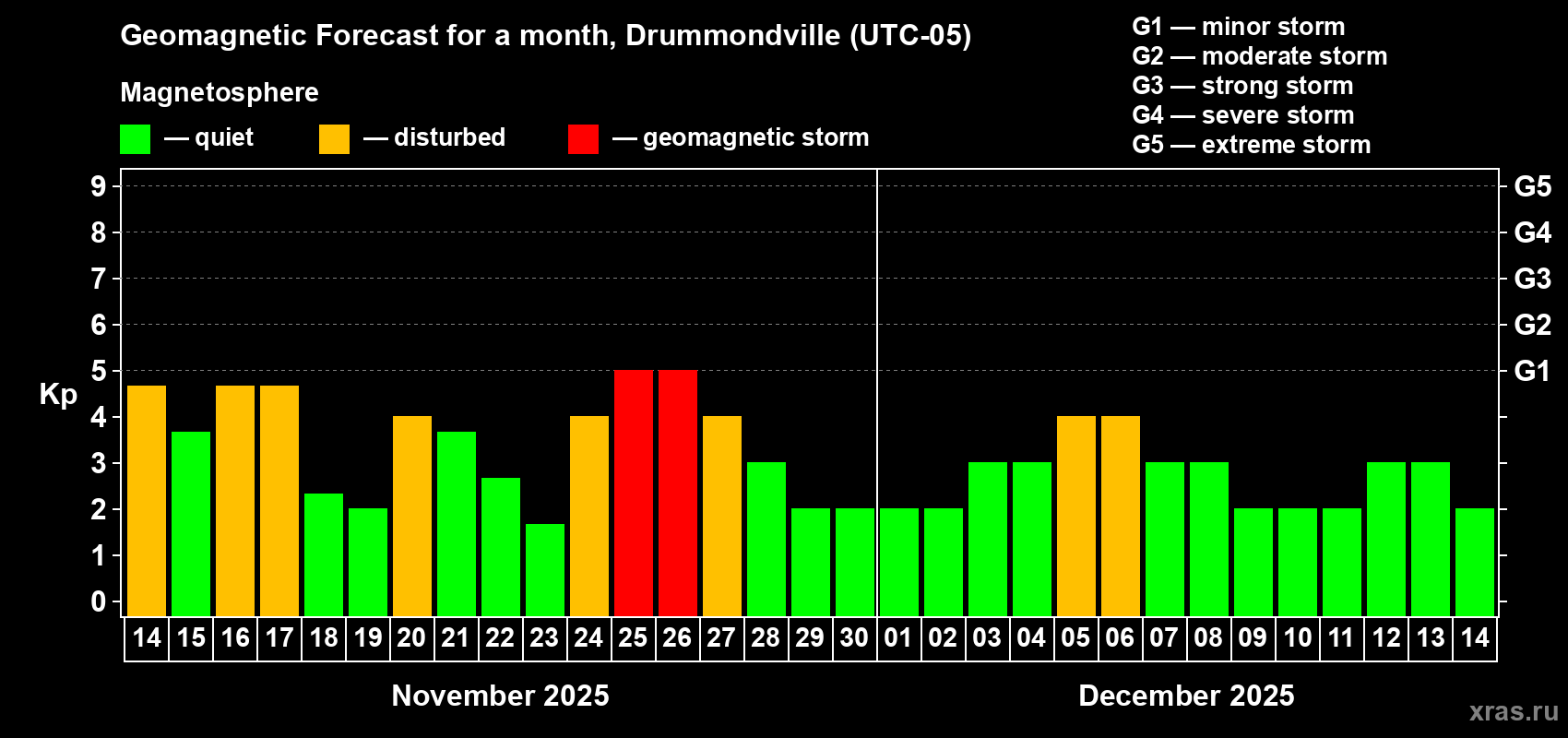 Geomagnetic storm forecast in Drummondville for Nov 14, 2025