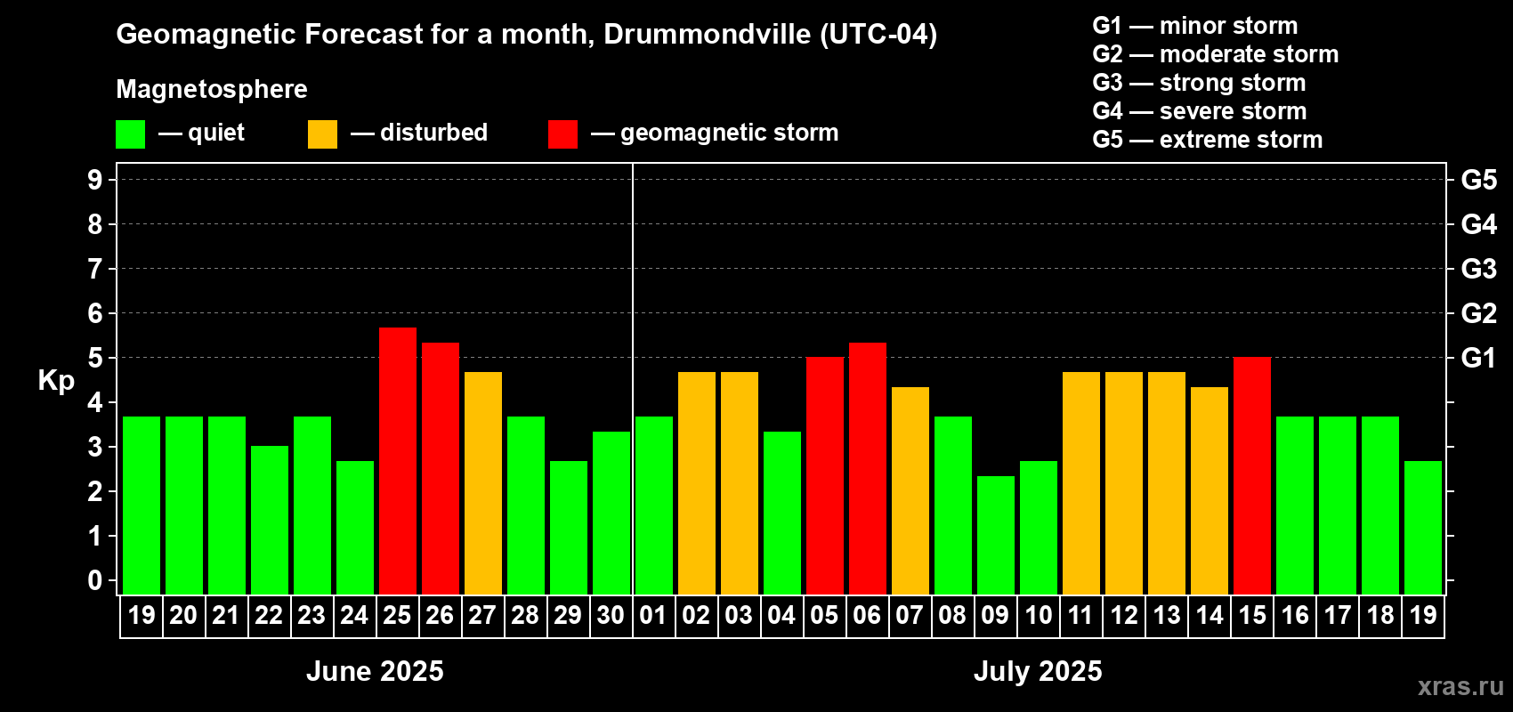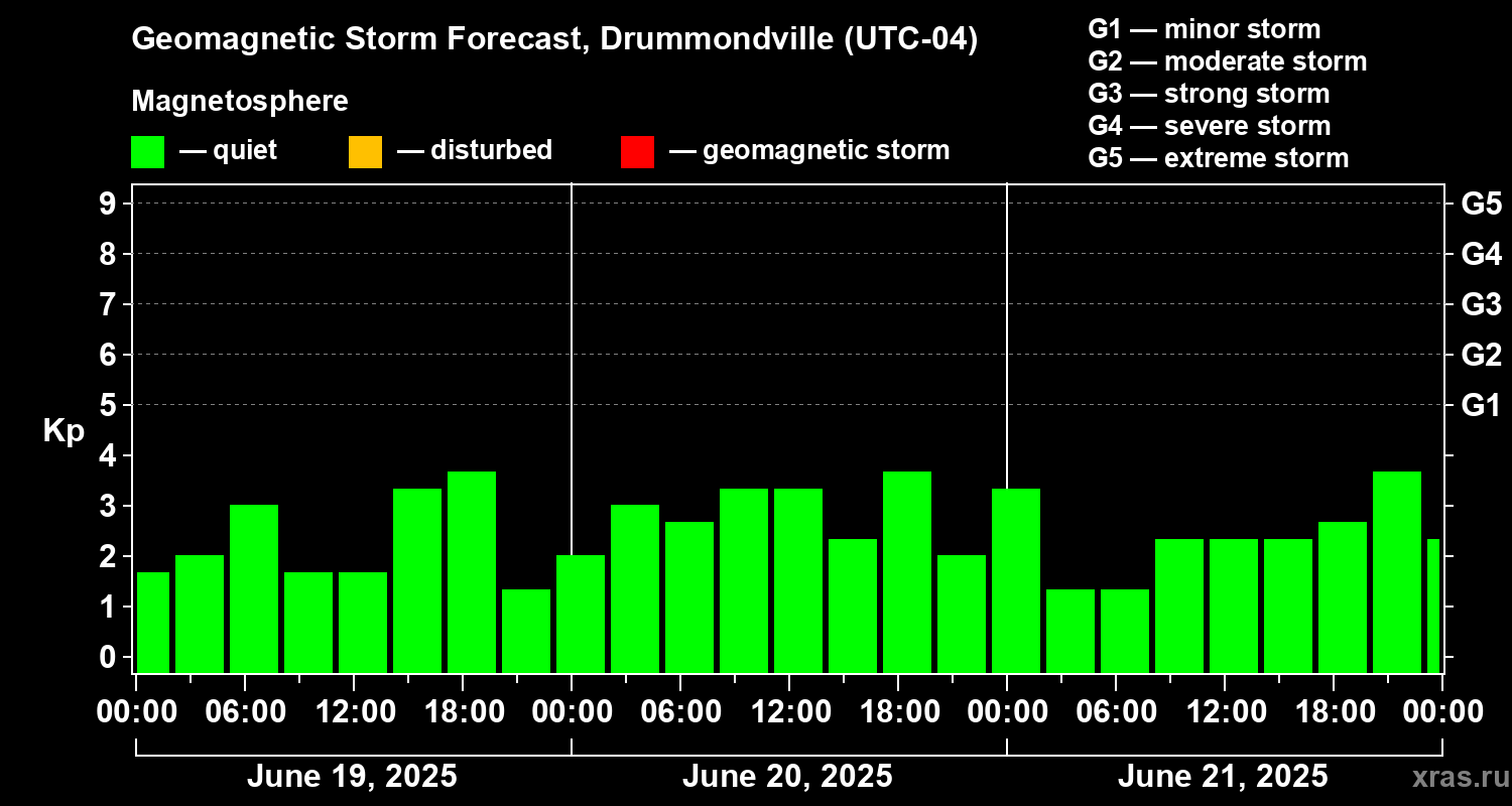 Geomagnetic storm forecast in Drummondville for Jun 19, 2025