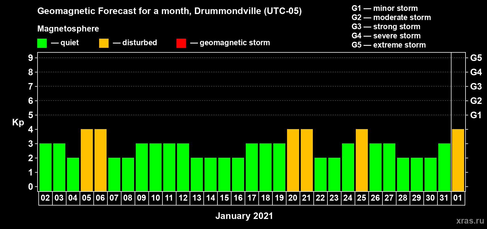 Geomagnetic storm forecast in Drummondville for Jan 02, 2021