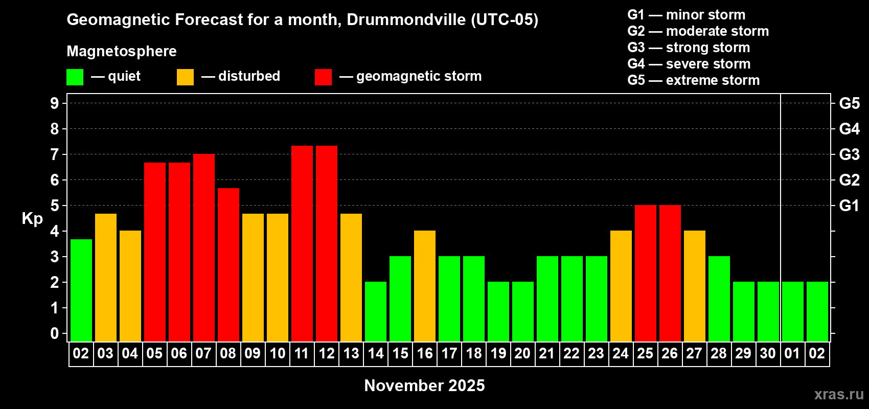 Geomagnetic storm forecast in Drummondville for Nov 02, 2025
