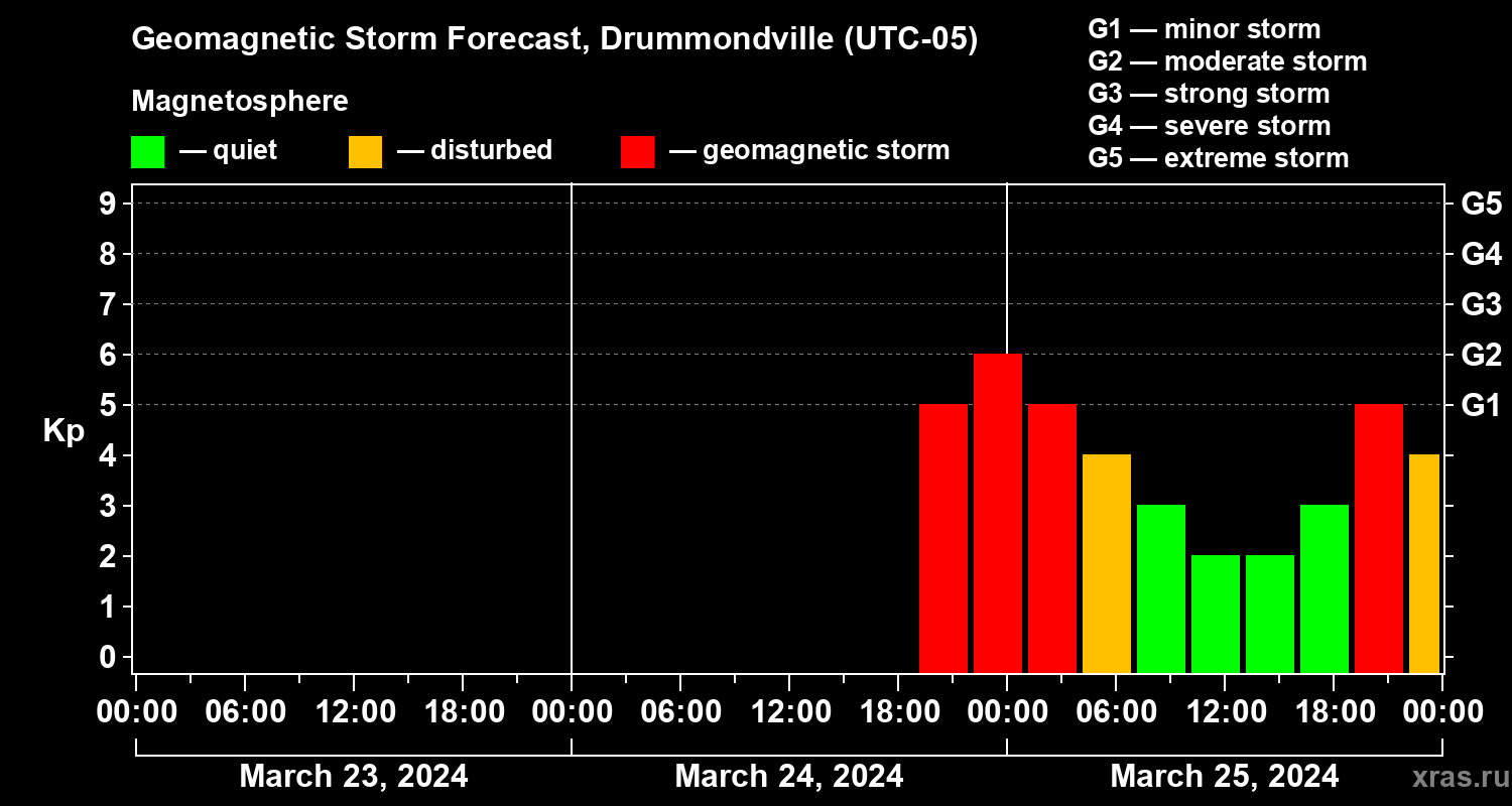Geomagnetic storm forecast in Drummondville for Mar 23, 2024