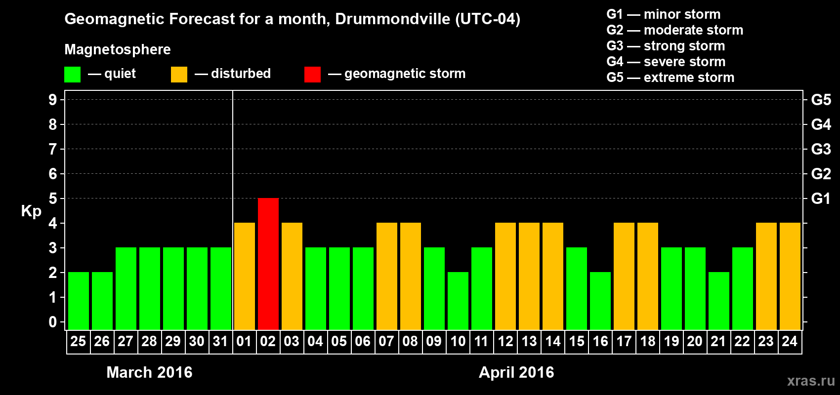 Geomagnetic storm forecast in Drummondville for Mar 25, 2016