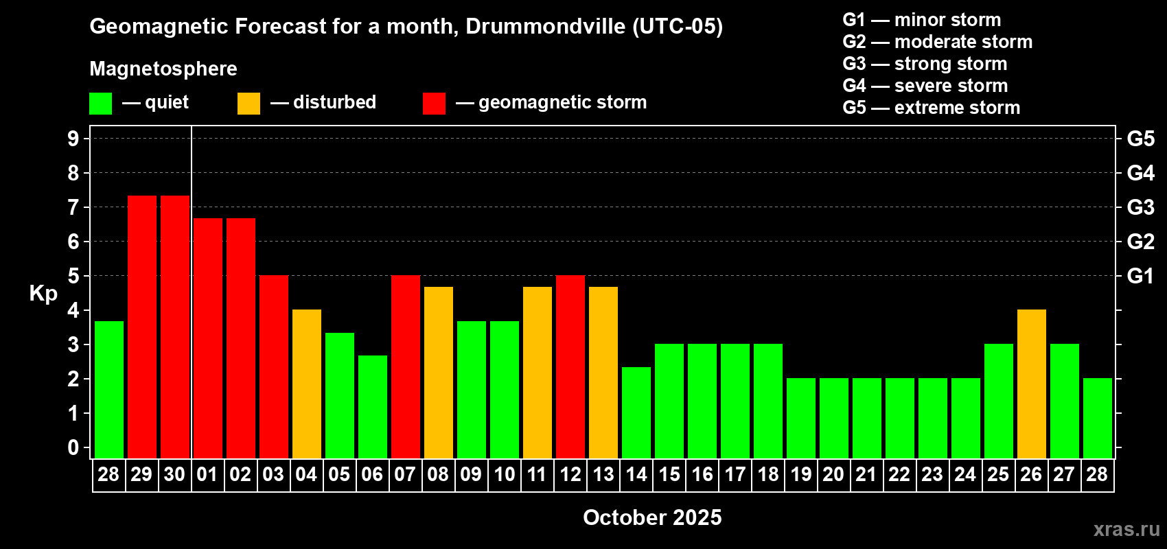 Geomagnetic storm forecast in Drummondville for Sep 28, 2025