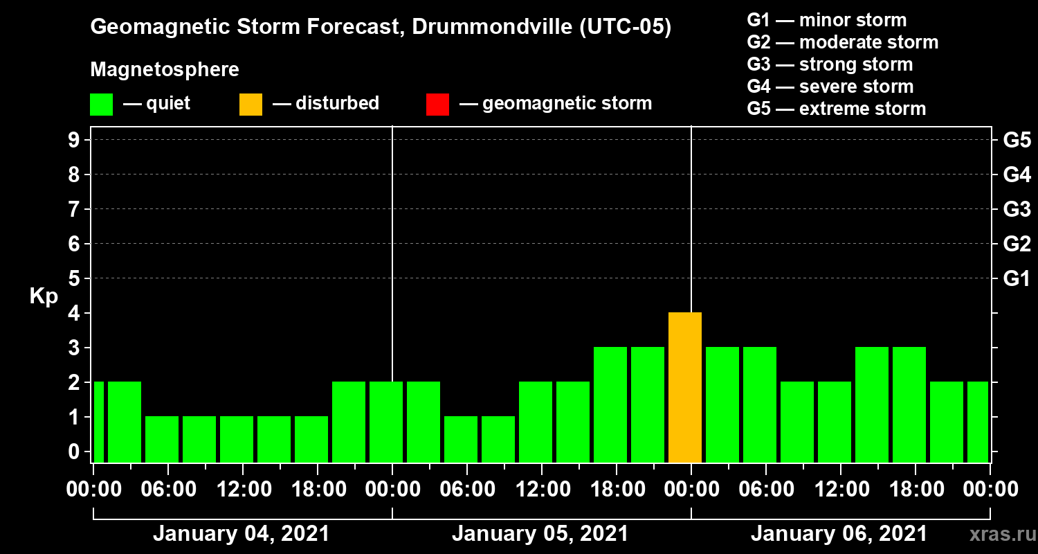 Geomagnetic storm forecast in Drummondville for Jan 04, 2021