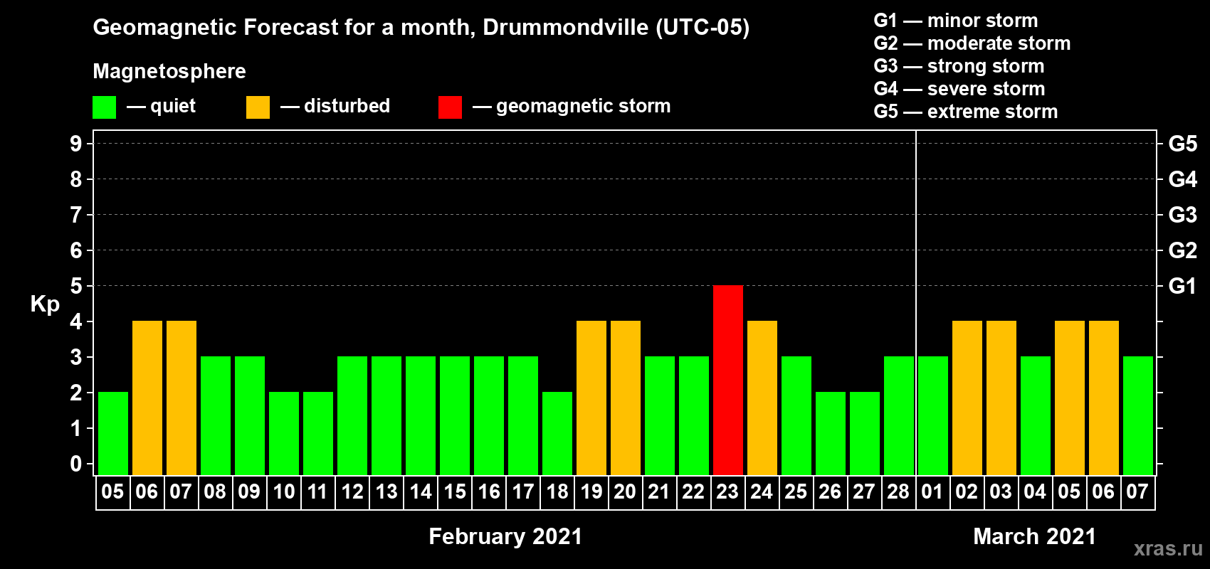 Geomagnetic storm forecast in Drummondville for Feb 05, 2021