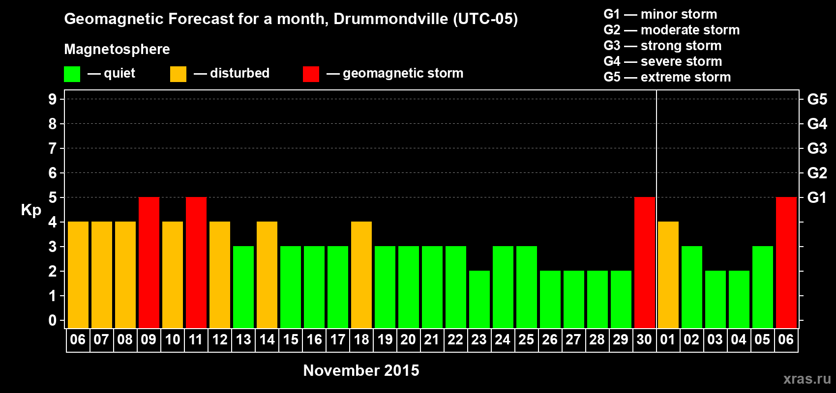 Geomagnetic storm forecast in Drummondville for Nov 06, 2015