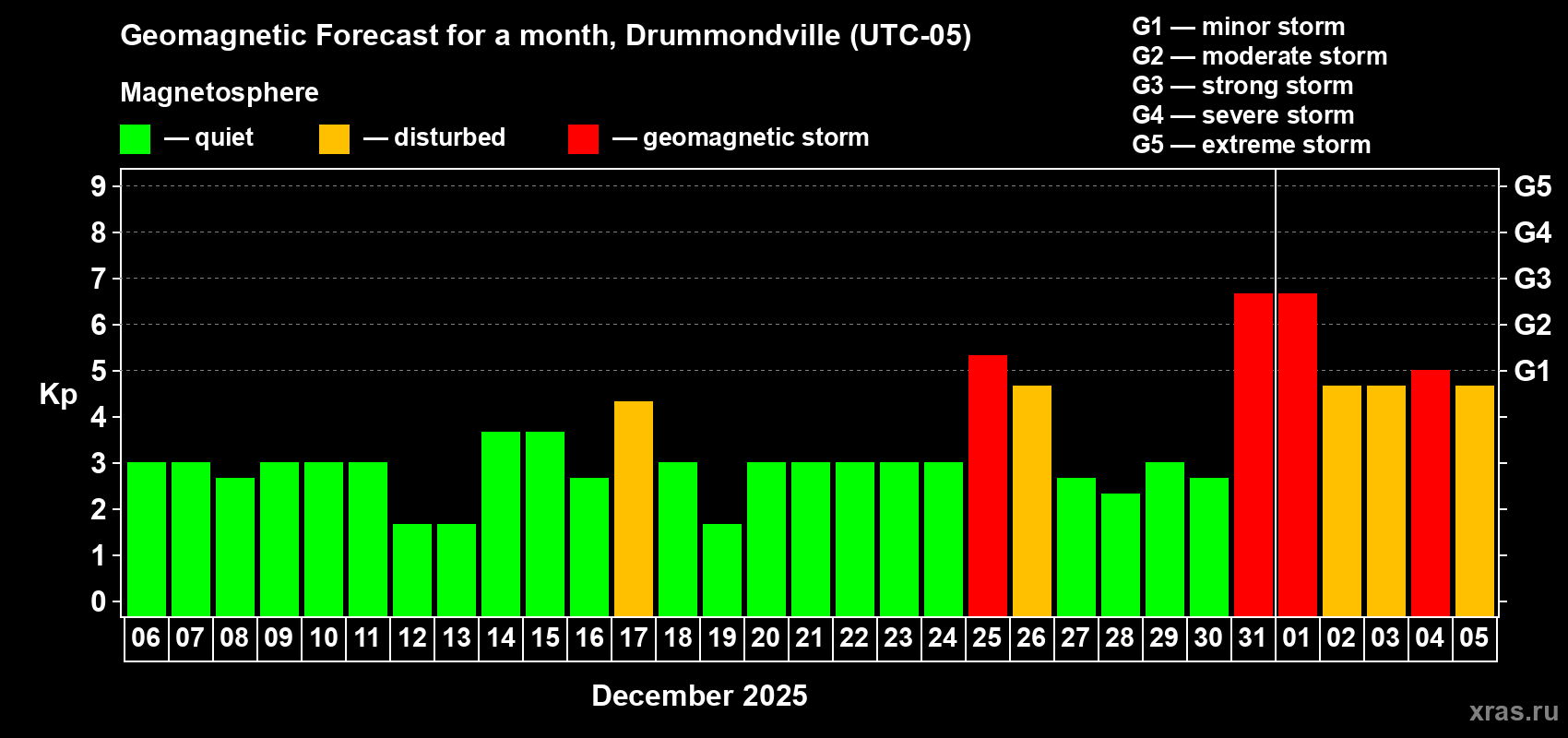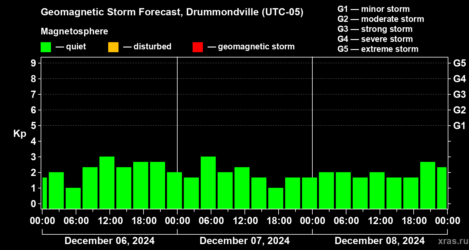 Geomagnetic storm forecast in Drummondville for Dec 06, 2024
