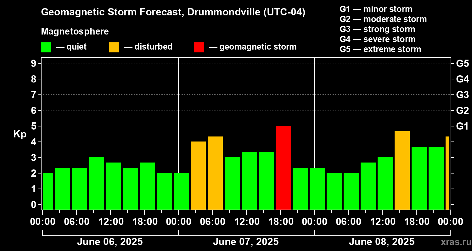 Geomagnetic storm forecast in Drummondville for Jun 06, 2025