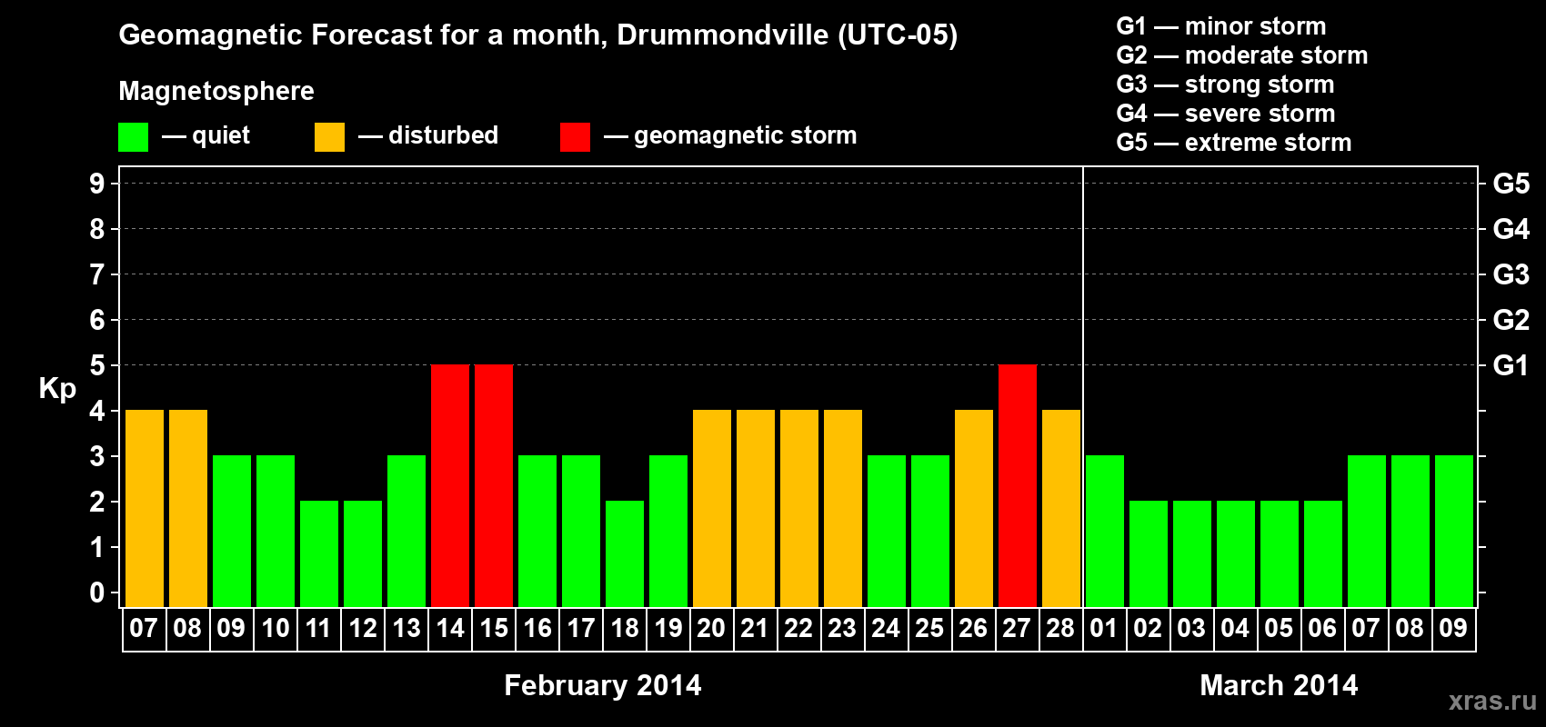 Geomagnetic storm forecast in Drummondville for Feb 07, 2014