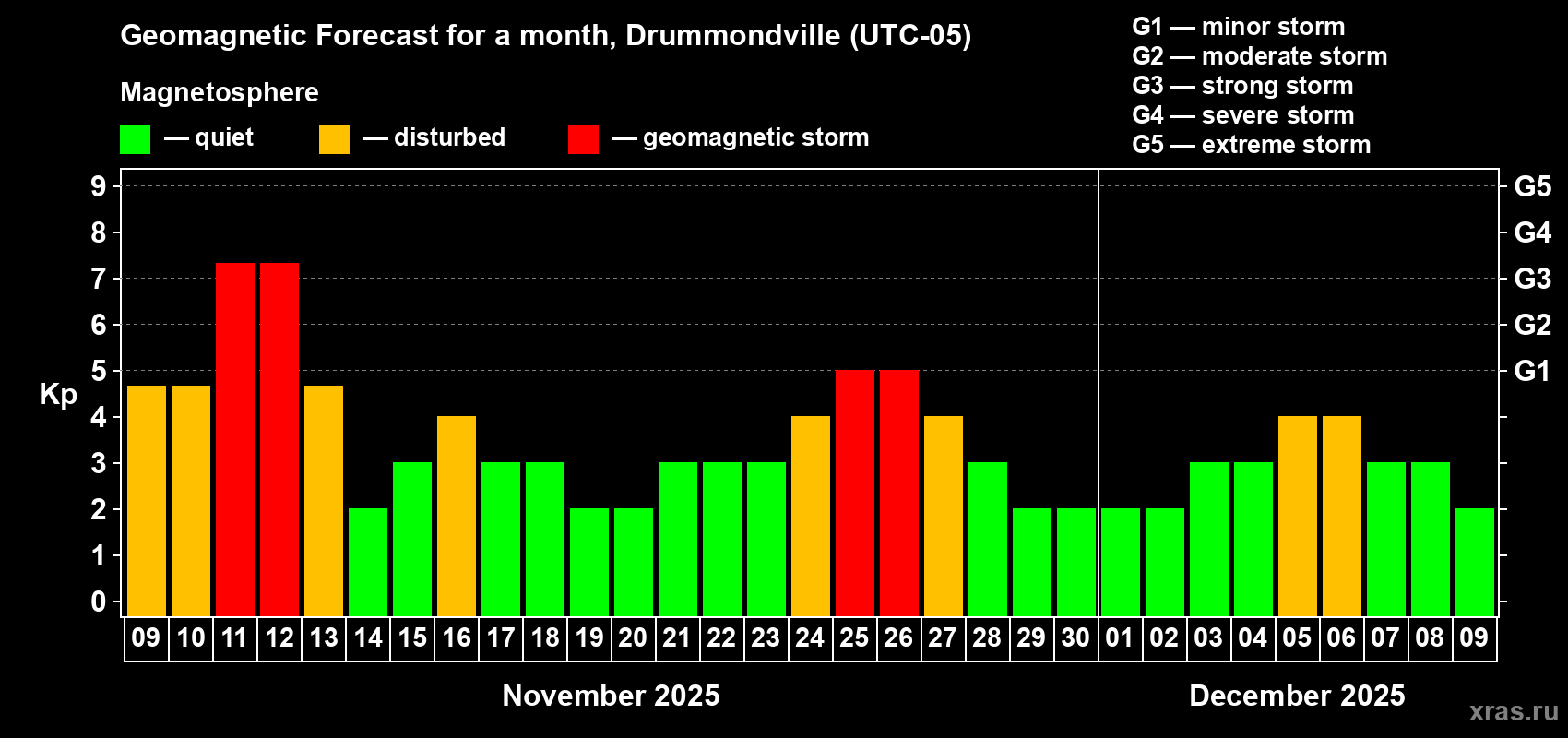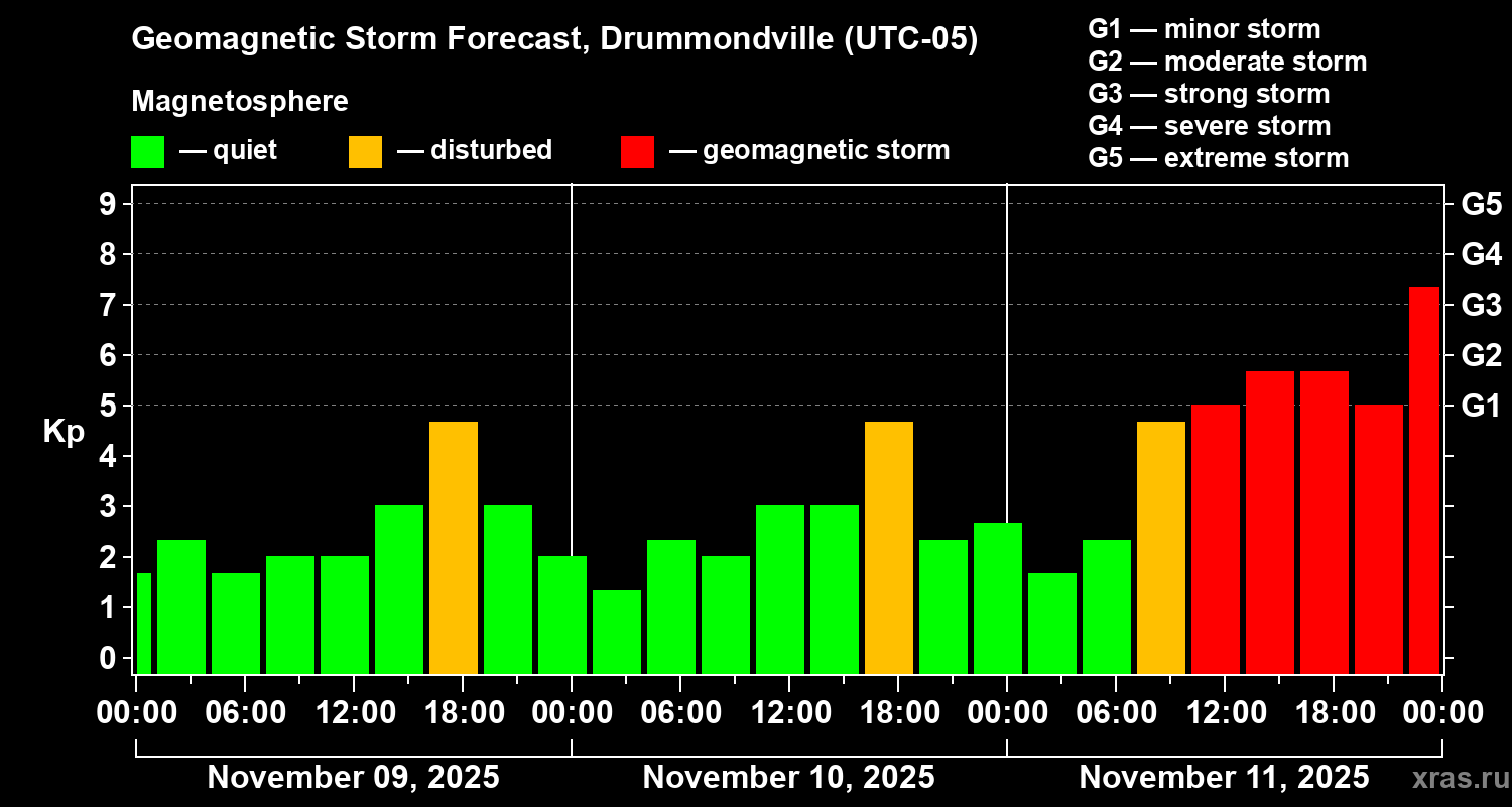 Geomagnetic storm forecast in Drummondville for Nov 09, 2025