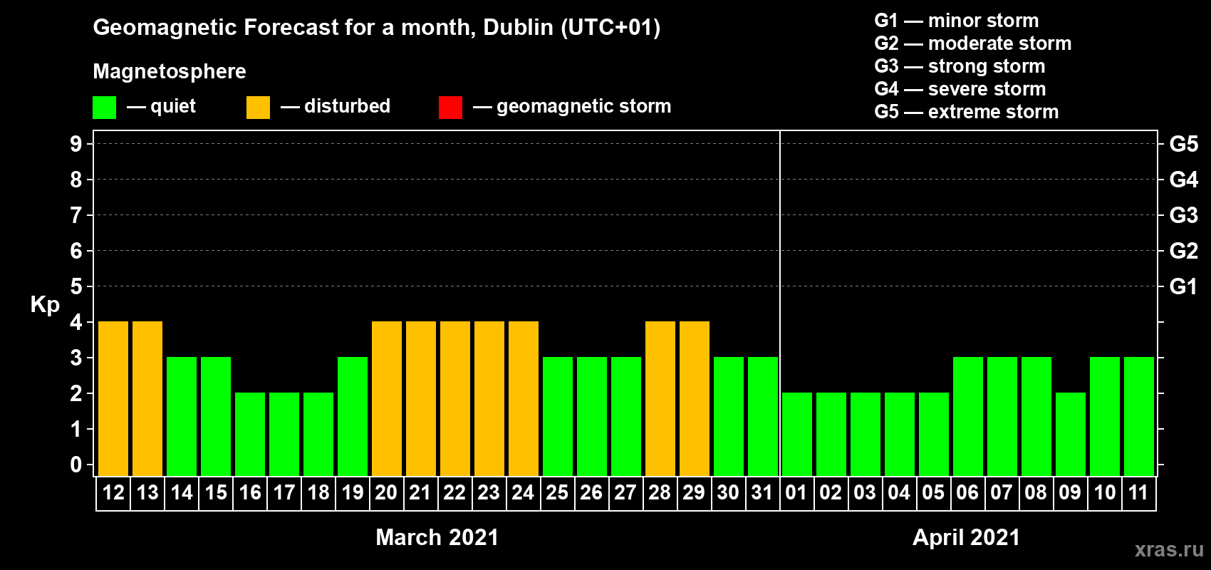 Geomagnetic storm forecast in Dublin for Mar 12, 2021