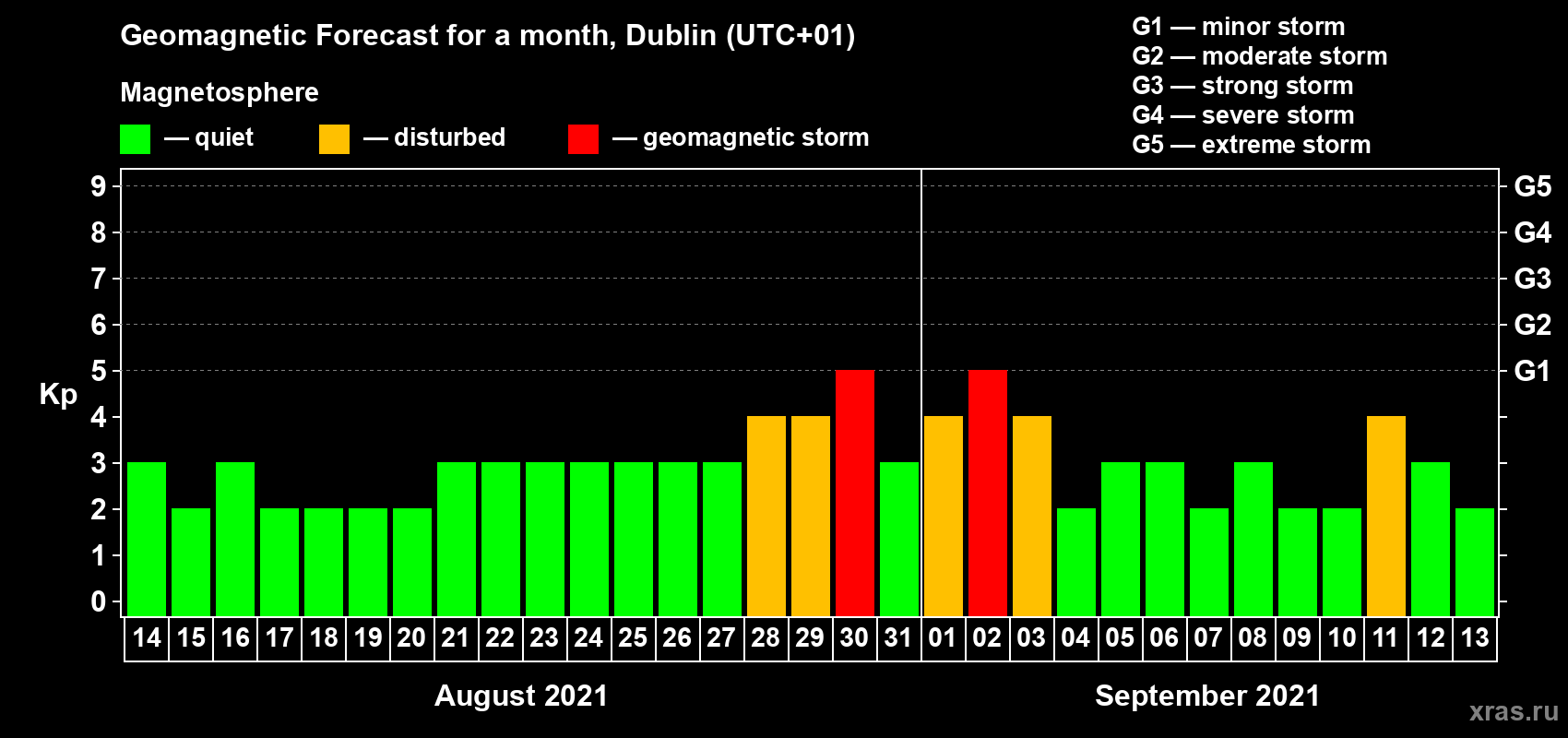 Geomagnetic storm forecast in Dublin for Aug 14, 2021
