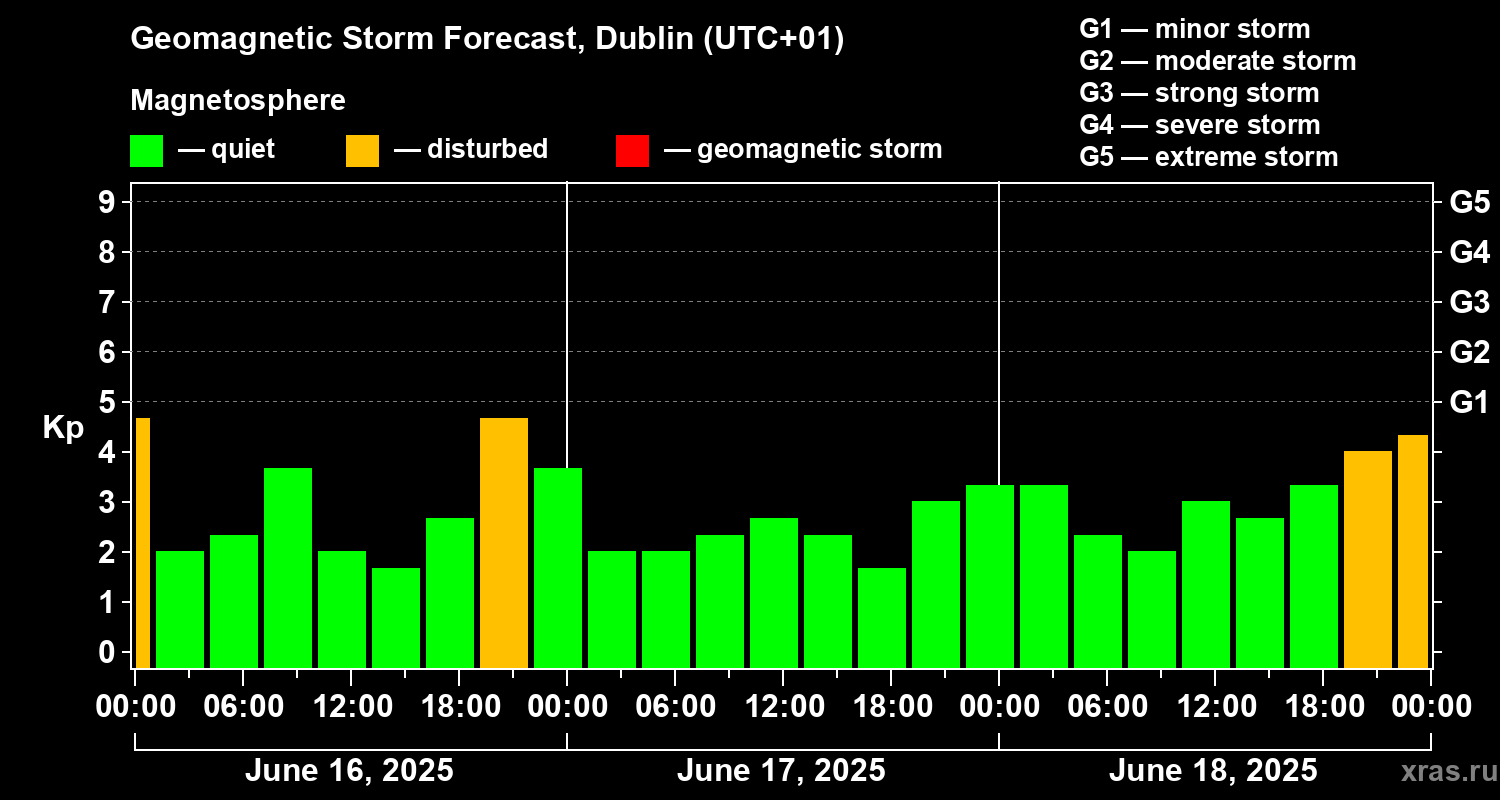 Geomagnetic storm forecast in Dublin for Jun 16, 2025