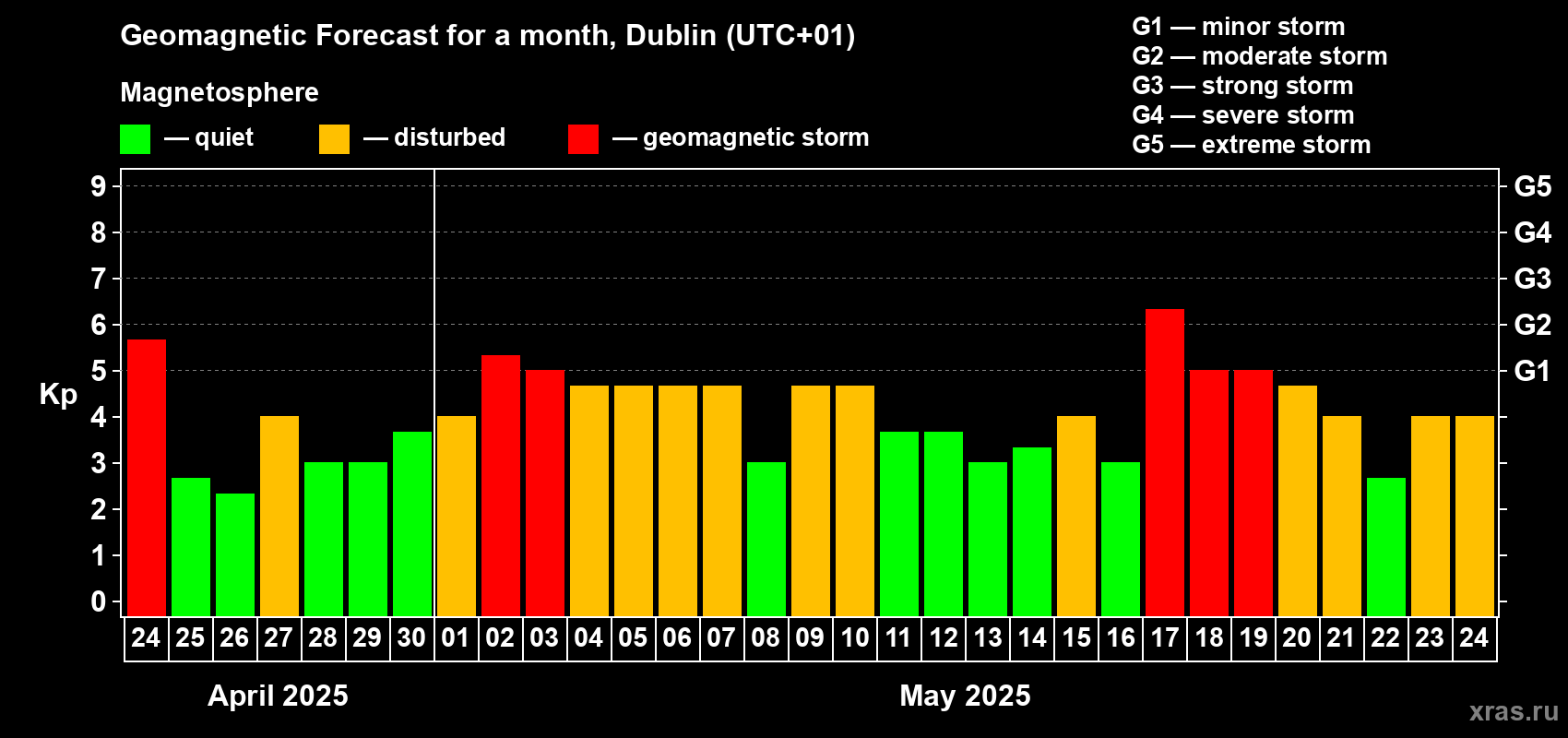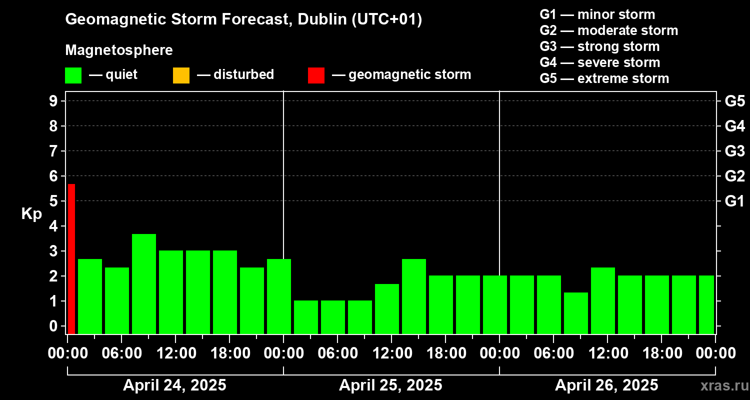 Geomagnetic storm forecast in Dublin for Apr 24, 2025