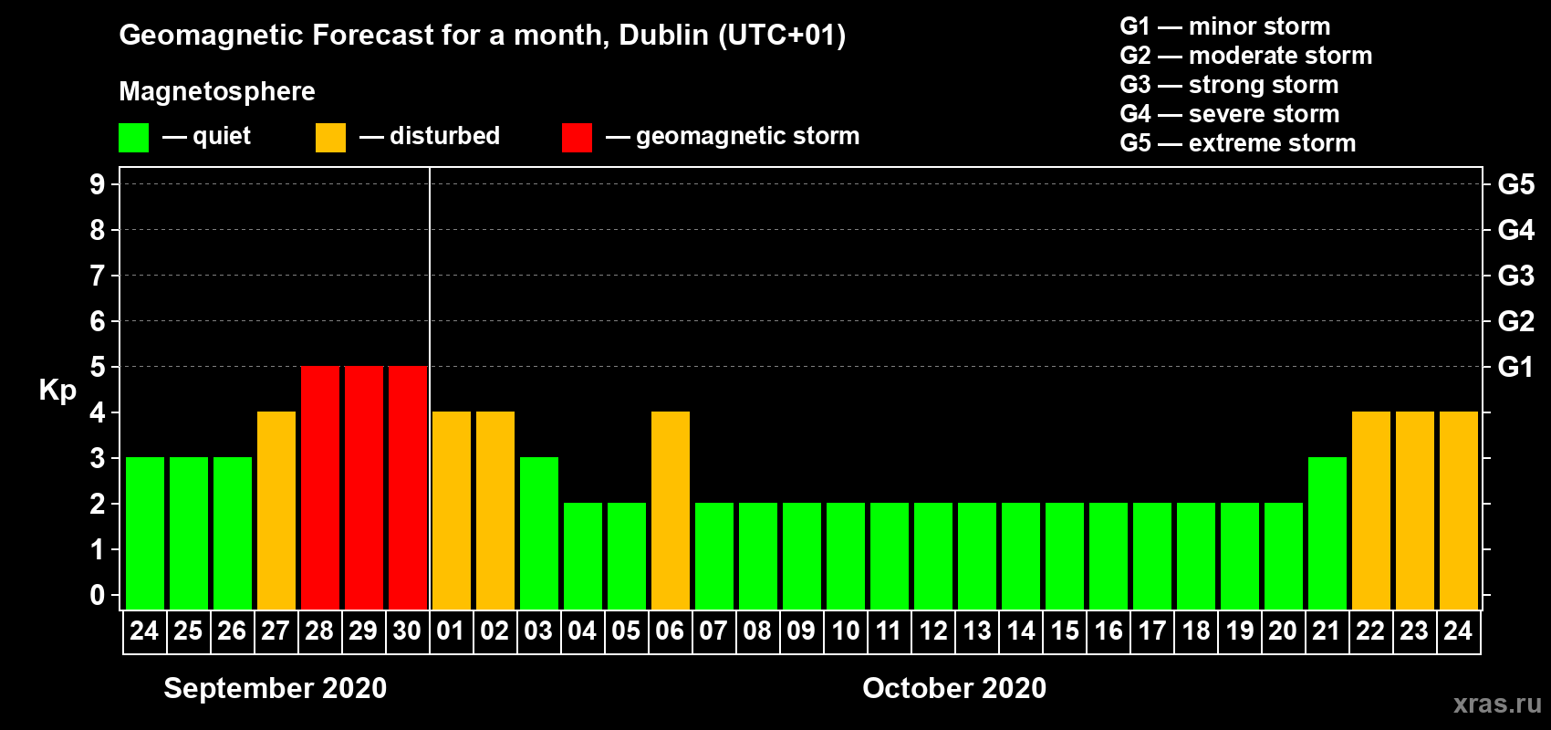 Geomagnetic storm forecast in Dublin for Sep 24, 2020