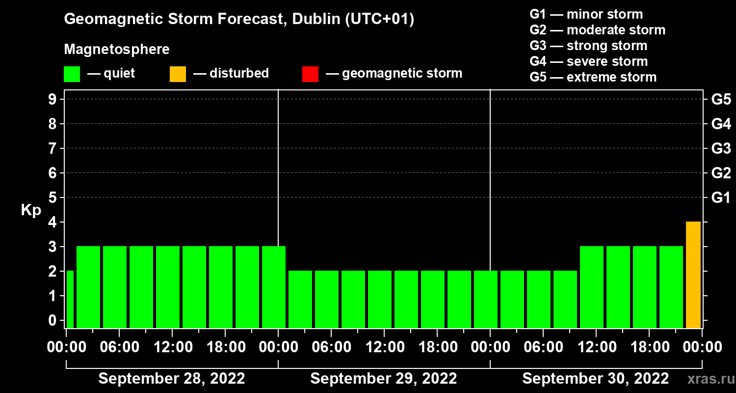 Geomagnetic storm forecast in Dublin for Sep 28, 2022
