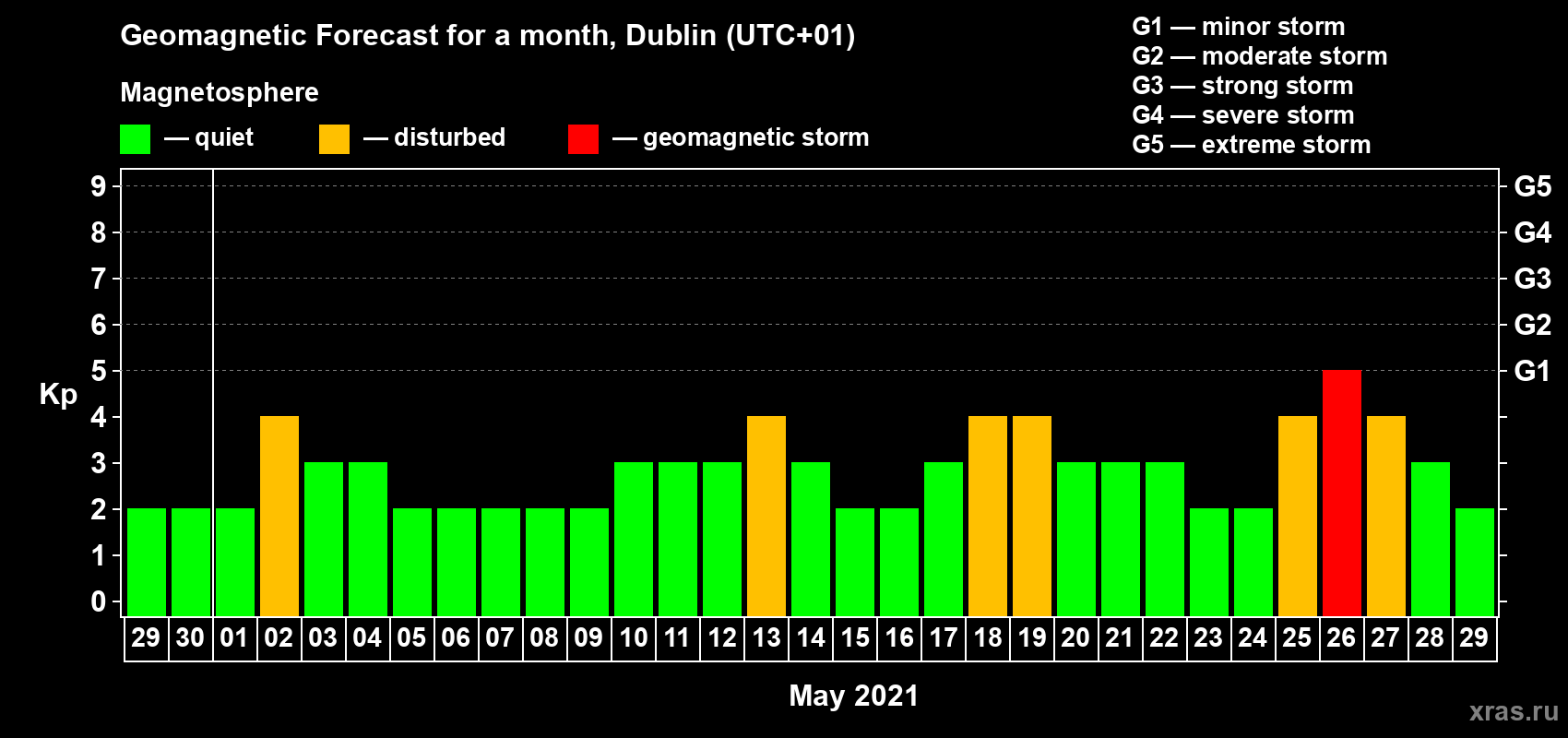 Geomagnetic storm forecast in Dublin for Apr 29, 2021