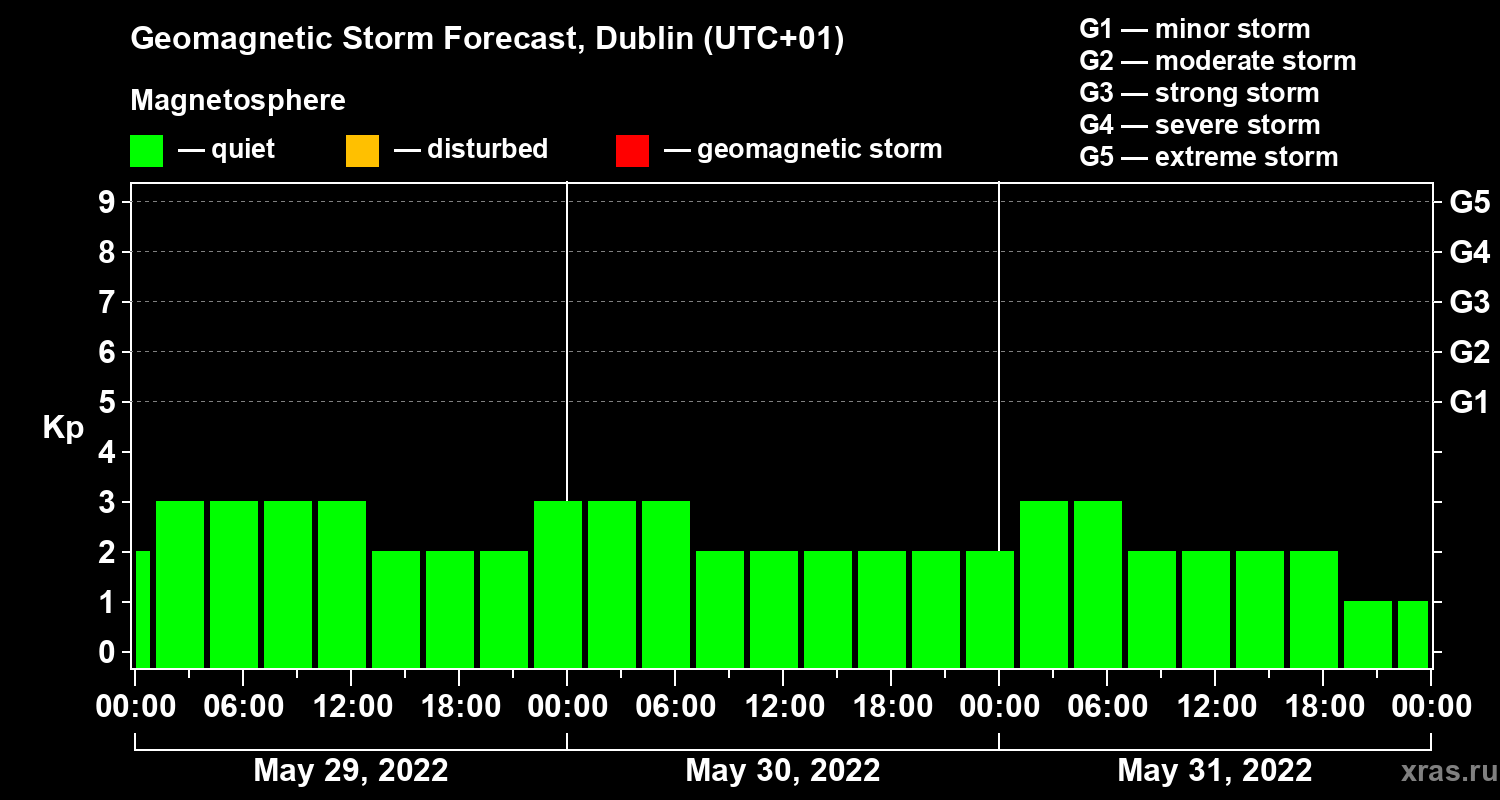 Geomagnetic storm forecast in Dublin for May 29, 2022