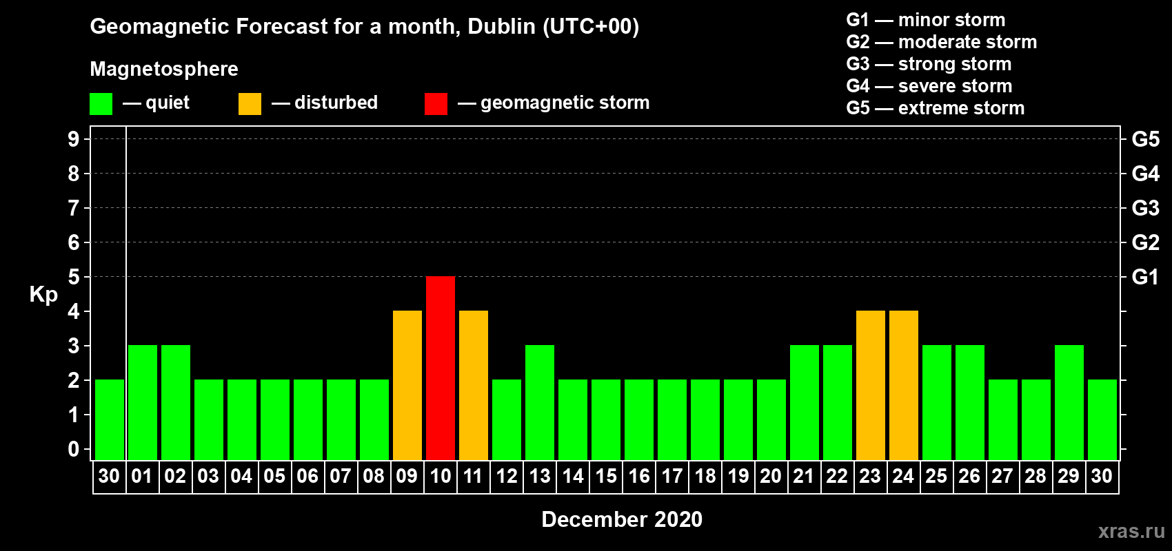 Geomagnetic storm forecast in Dublin for Nov 30, 2020