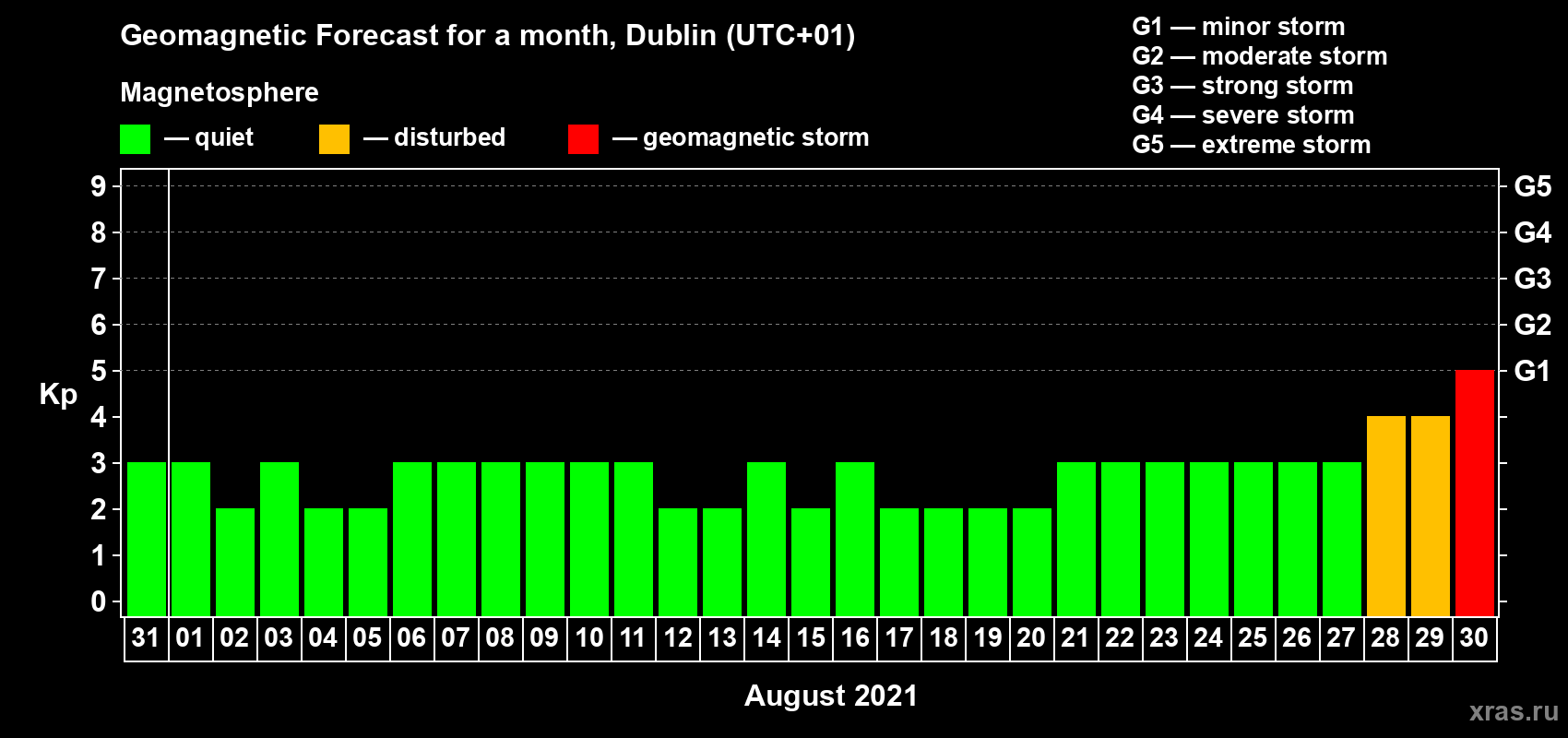 Geomagnetic storm forecast in Dublin for Jul 31, 2021
