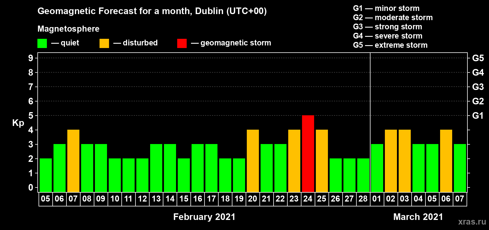 Geomagnetic storm forecast in Dublin for Feb 05, 2021