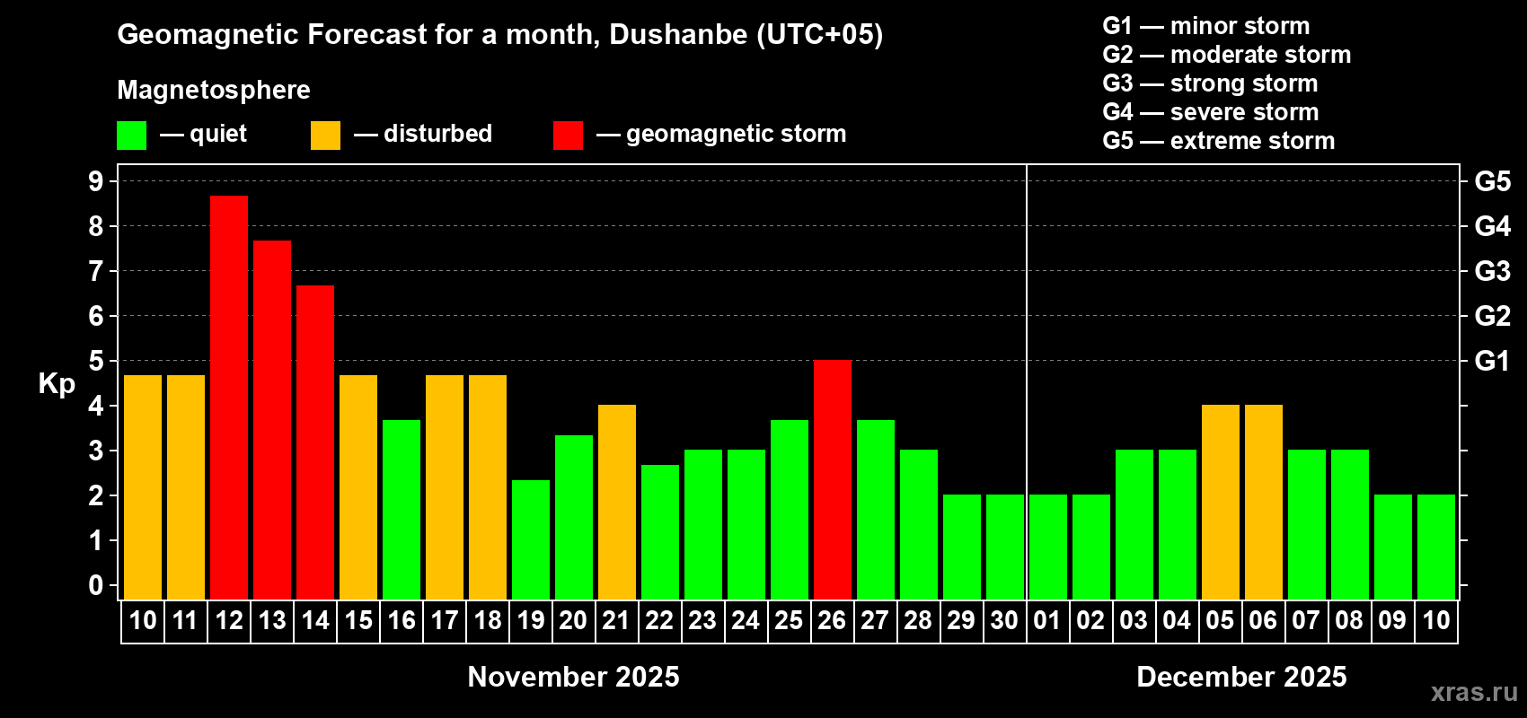 Geomagnetic storm forecast in Dushanbe for Nov 10, 2025