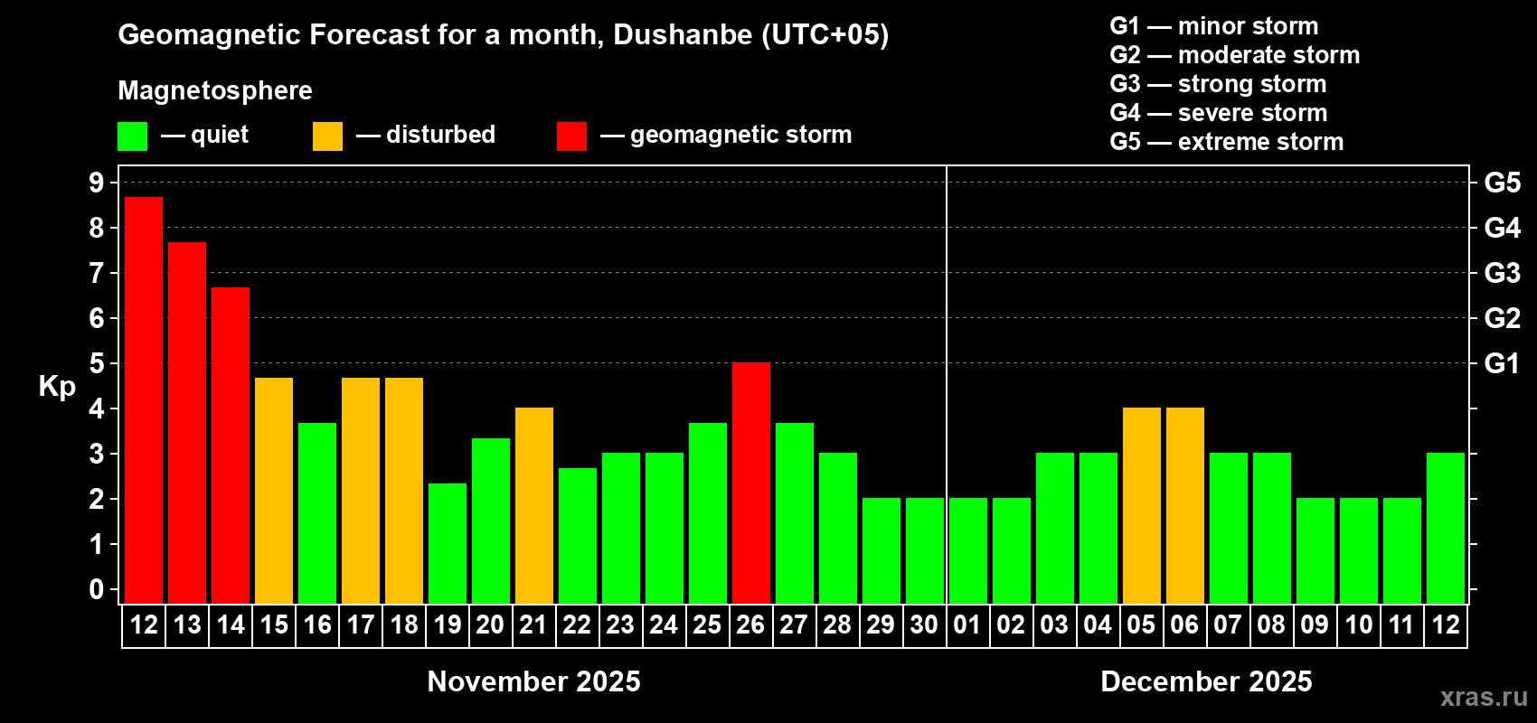 Geomagnetic storm forecast in Dushanbe for Nov 12, 2025