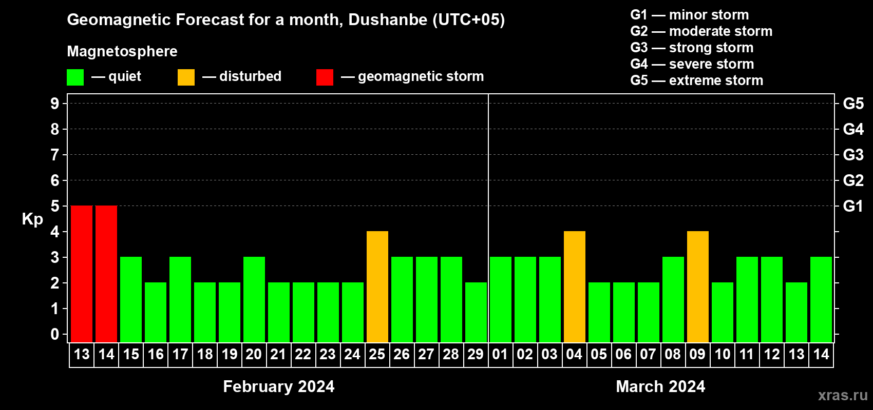 Geomagnetic storm forecast in Dushanbe for Feb 13, 2024