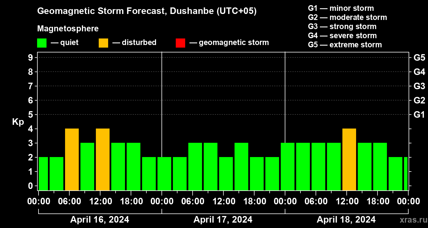 Geomagnetic storm forecast in Dushanbe for Apr 16, 2024