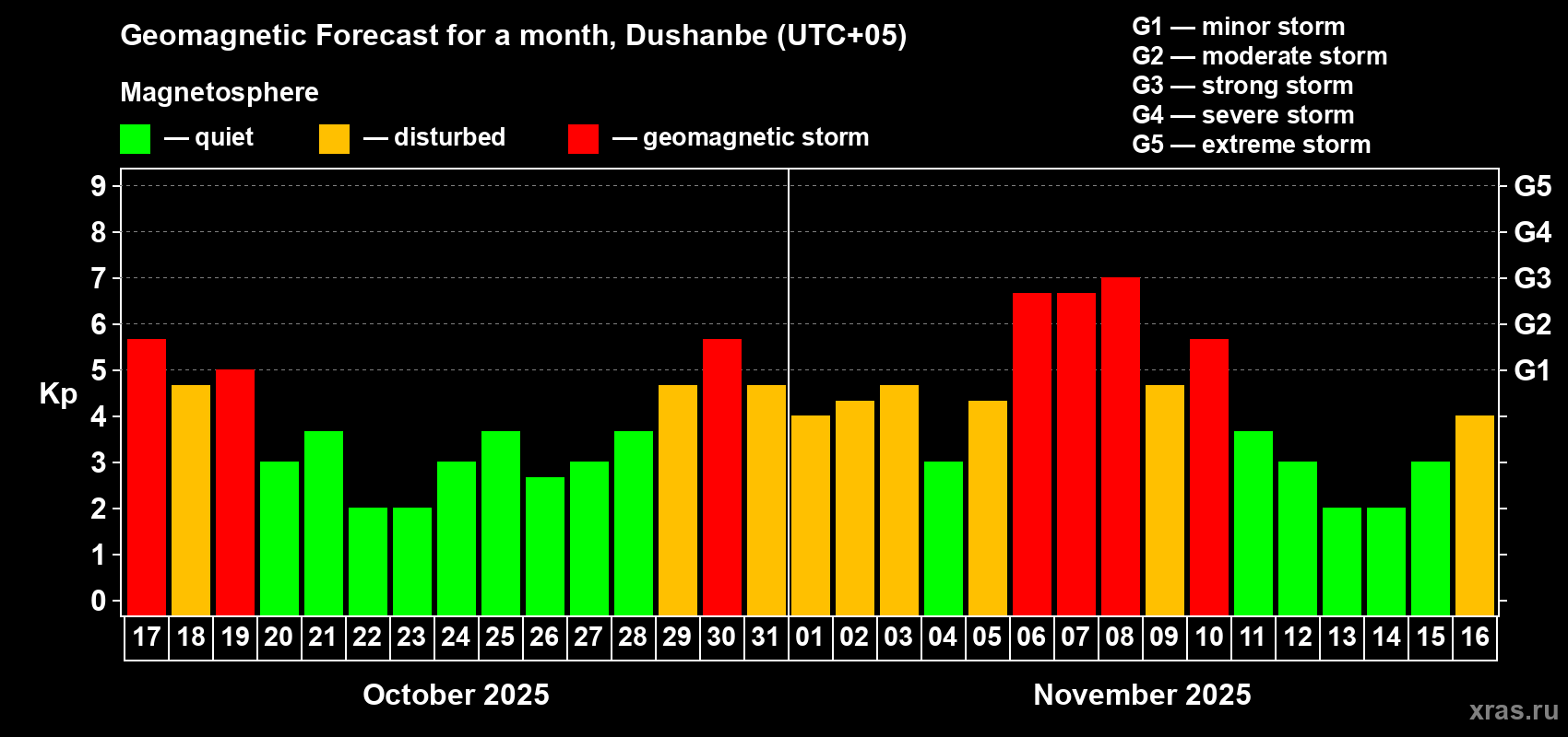 Geomagnetic storm forecast in Dushanbe for Oct 17, 2025