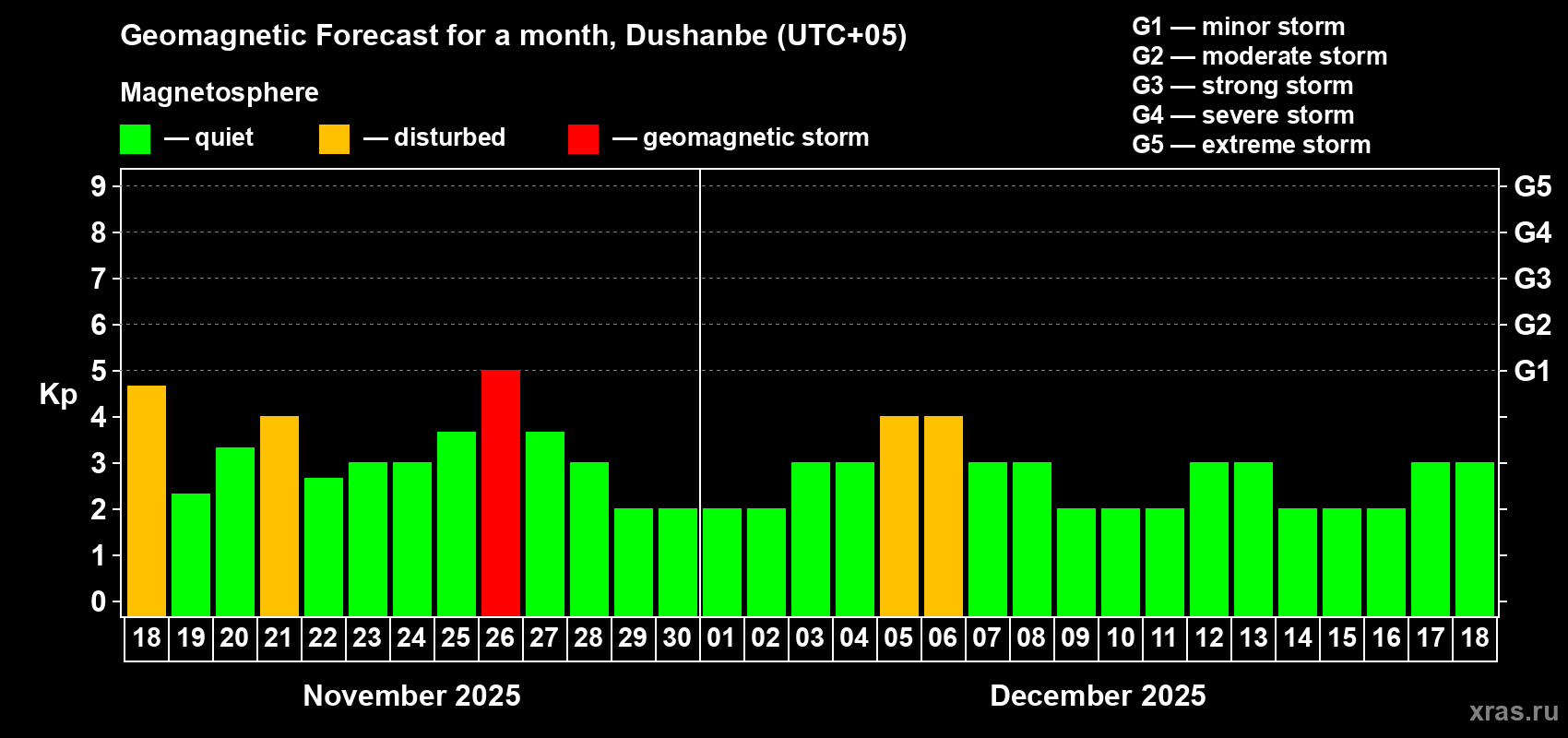 Geomagnetic storm forecast in Dushanbe for Nov 18, 2025