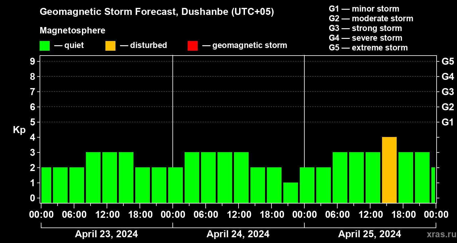Geomagnetic storm forecast in Dushanbe for Apr 23, 2024