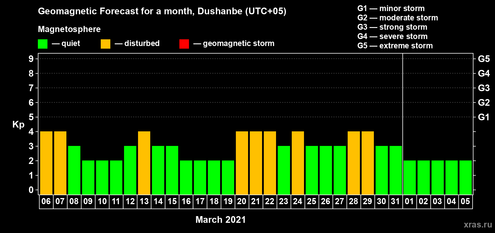 Geomagnetic storm forecast in Dushanbe for Mar 06, 2021