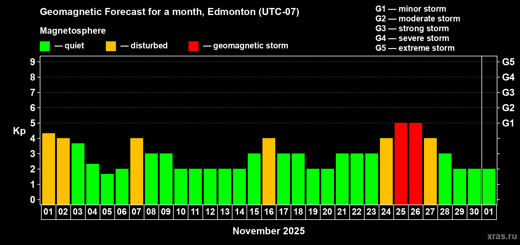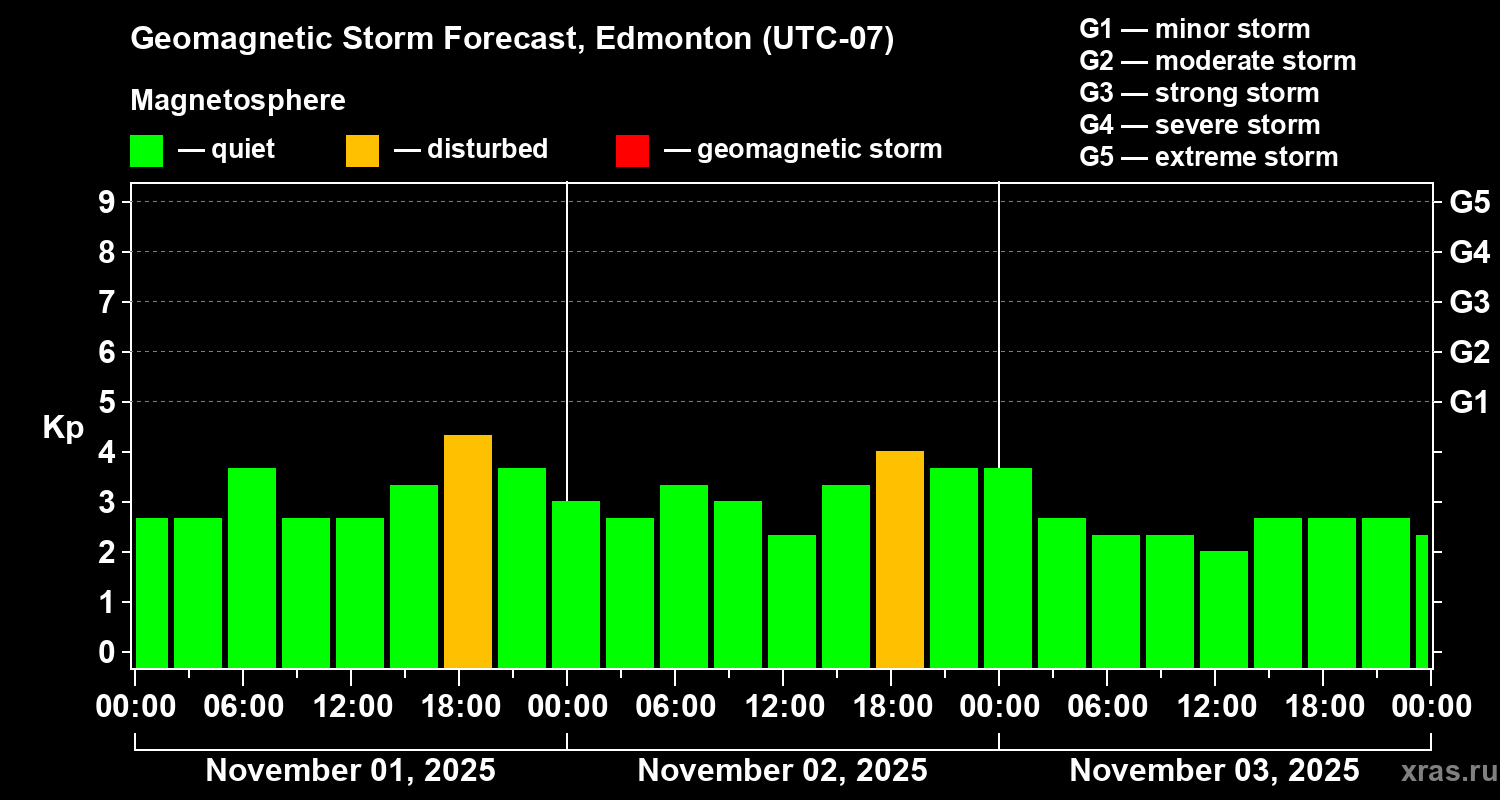 Geomagnetic storm forecast in Edmonton for Nov 01, 2025