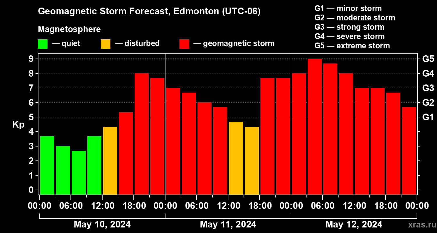 Geomagnetic storm forecast in Edmonton for May 10, 2024