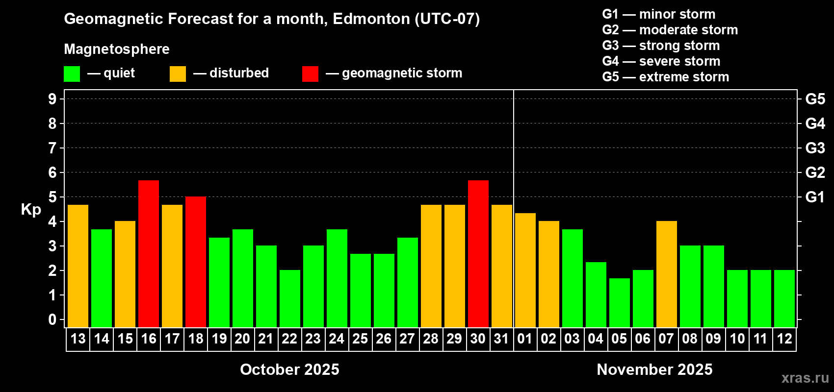 Geomagnetic storm forecast in Edmonton for Oct 13, 2025