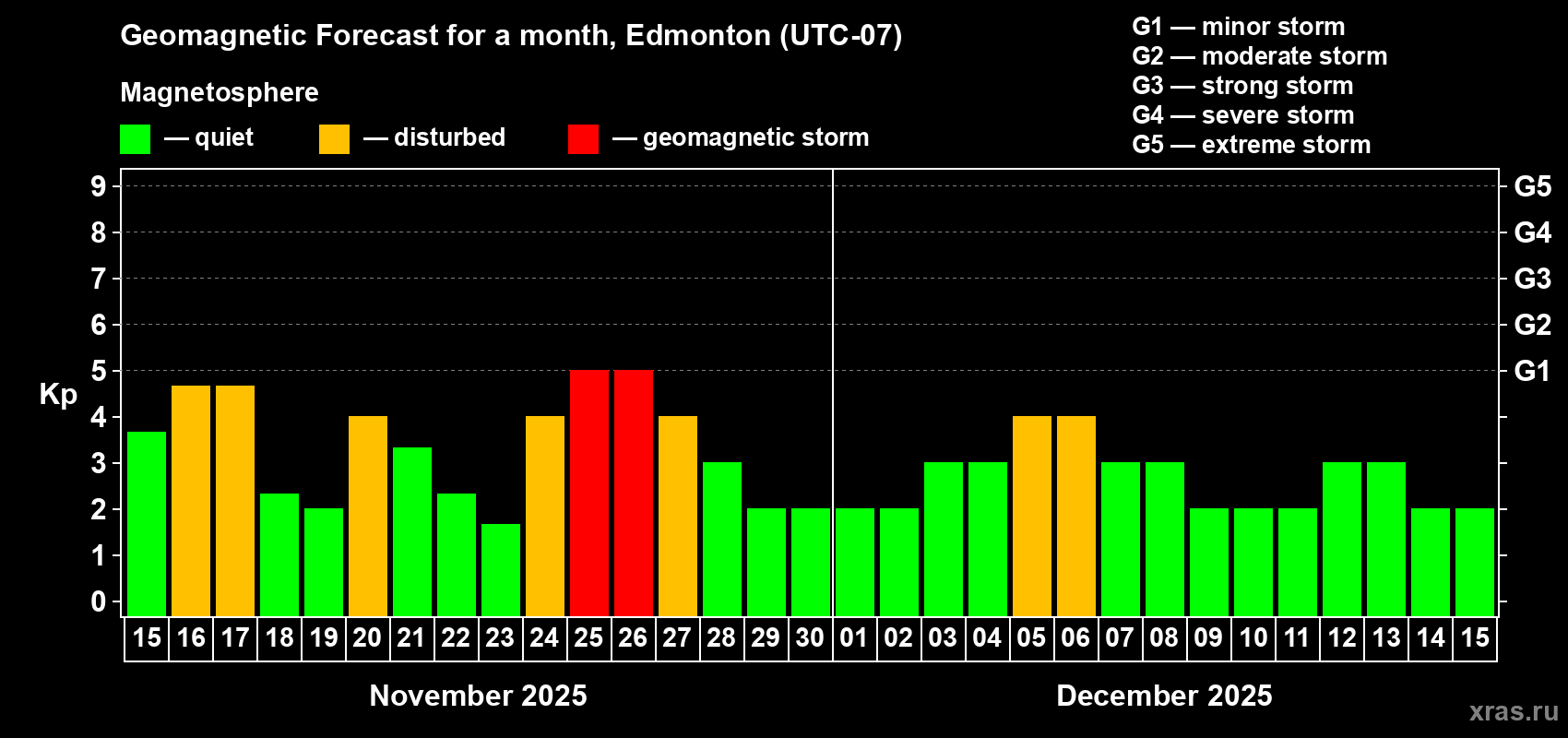 Geomagnetic storm forecast in Edmonton for Nov 15, 2025