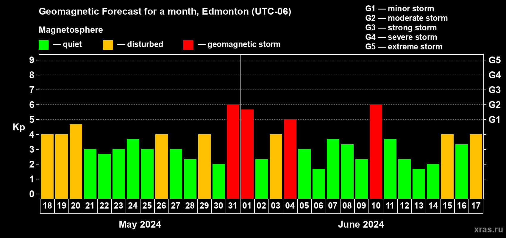 Geomagnetic storm forecast in Edmonton for May 18, 2024
