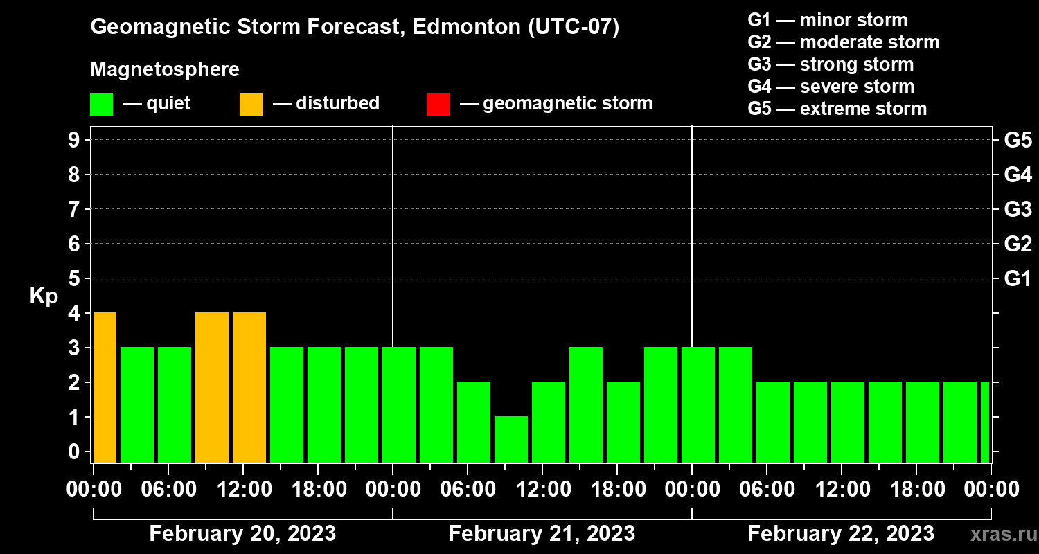 Geomagnetic storm forecast in Edmonton for Feb 20, 2023