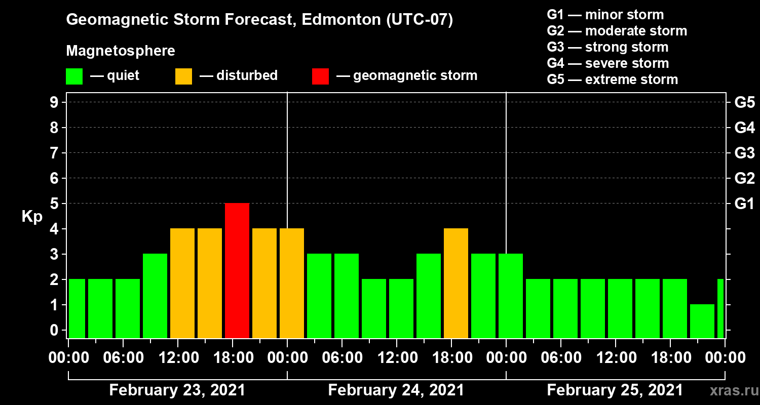 Geomagnetic storm forecast in Edmonton for Feb 23, 2021