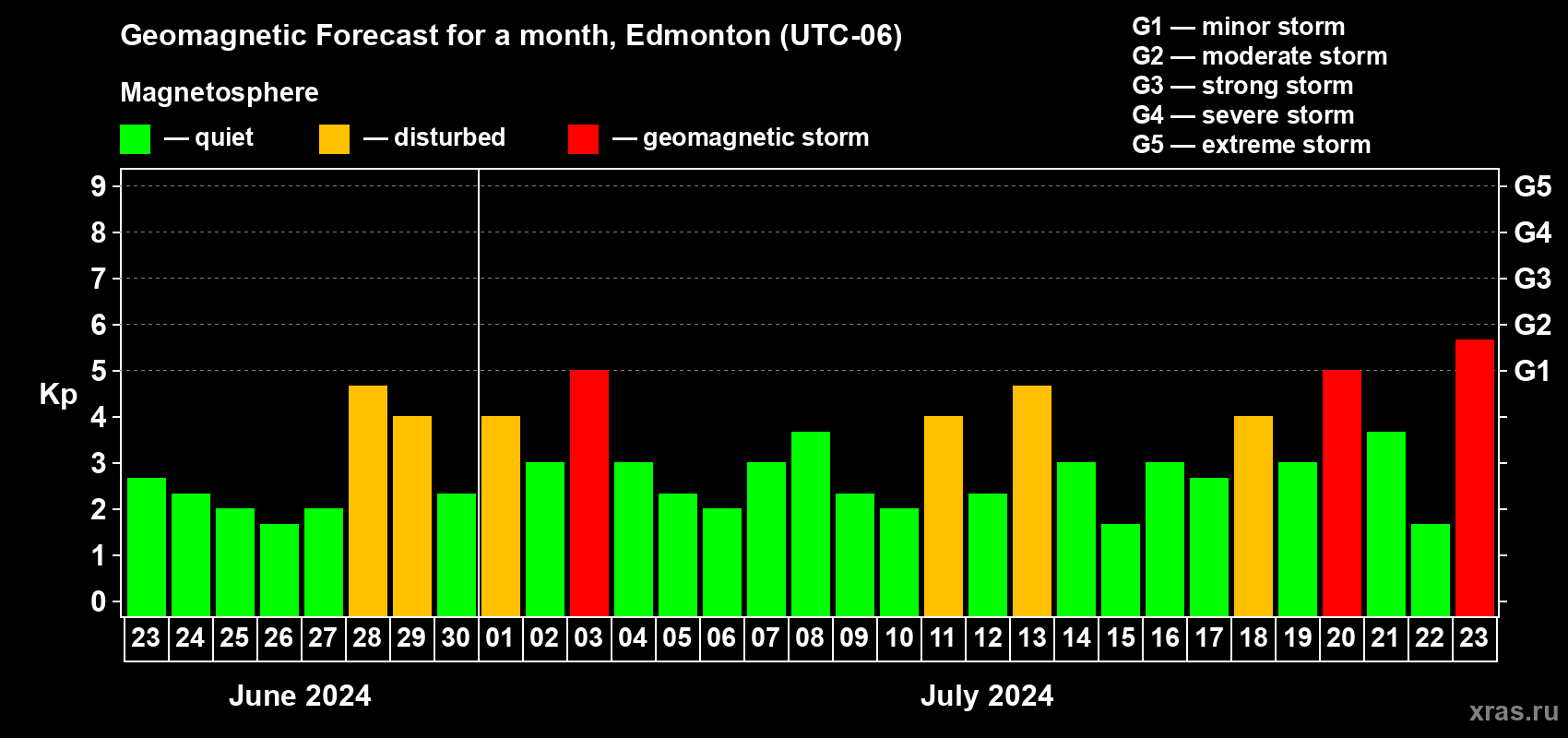 Geomagnetic storm forecast in Edmonton for Jun 23, 2024