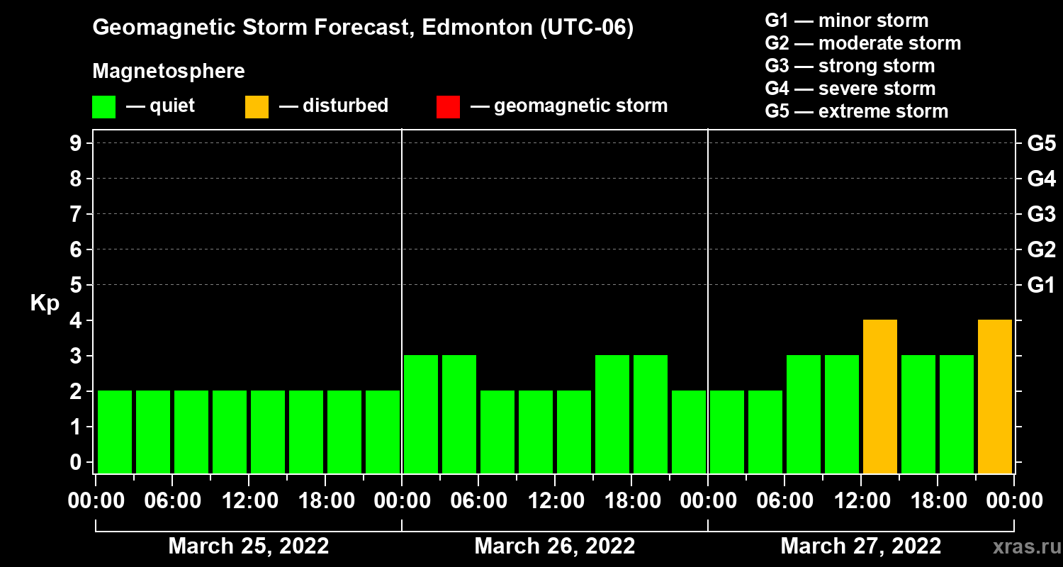 Geomagnetic storm forecast in Edmonton for Mar 25, 2022