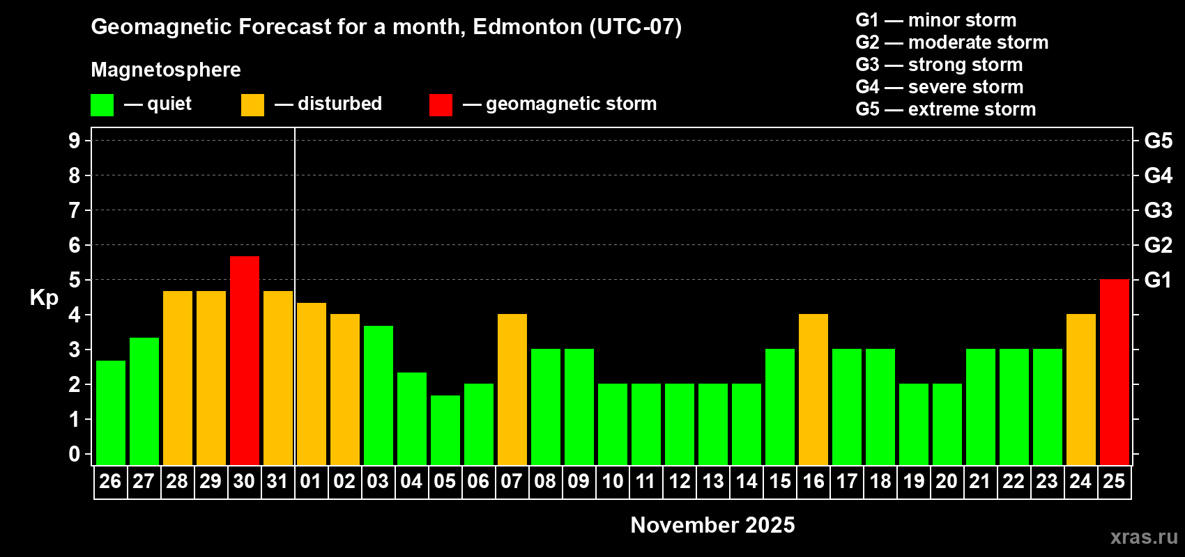 Geomagnetic storm forecast in Edmonton for Oct 26, 2025