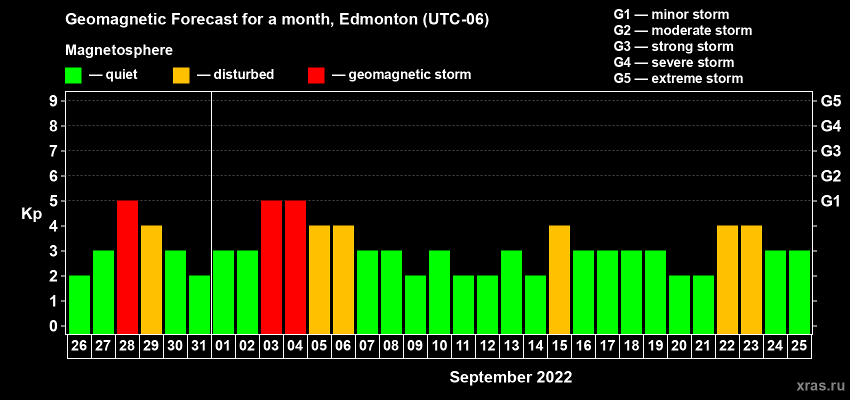 Geomagnetic storm forecast in Edmonton for Aug 26, 2022