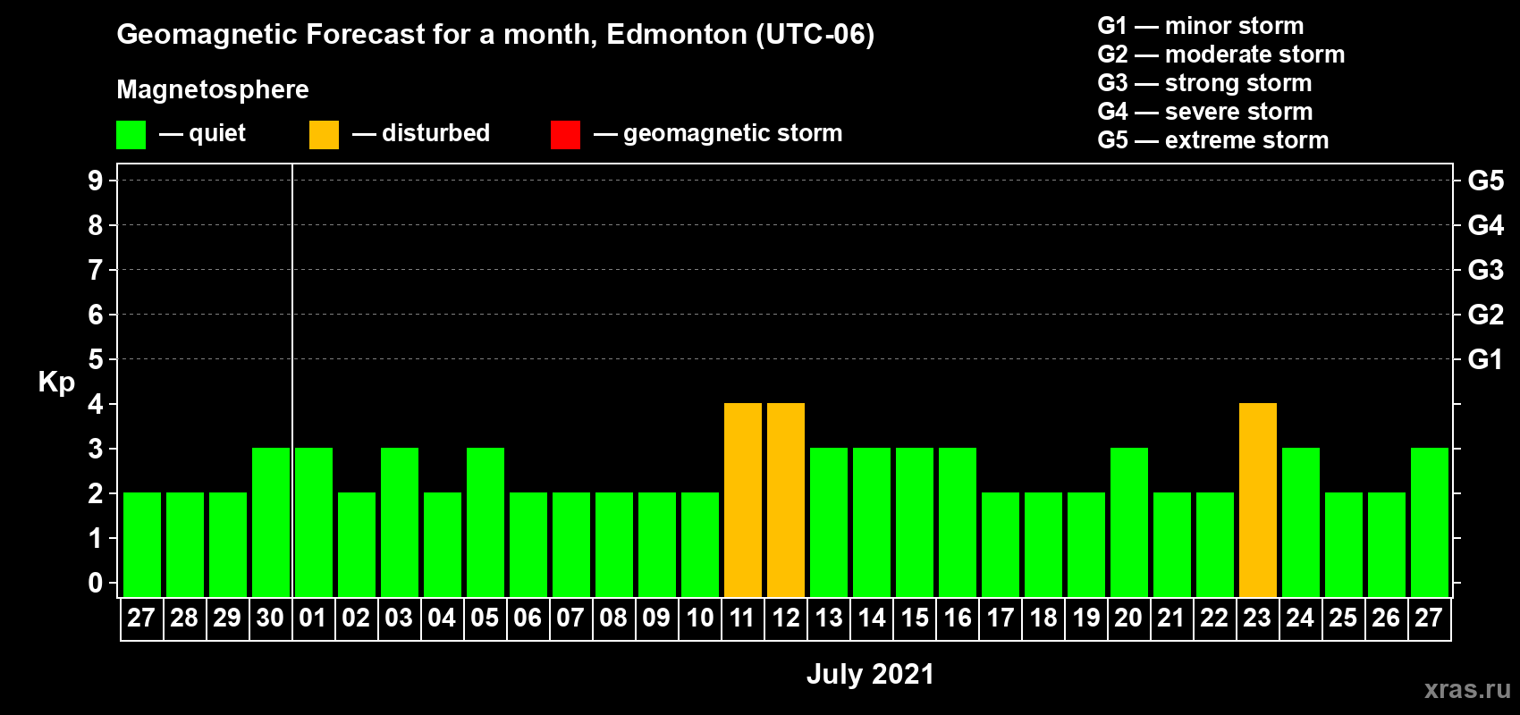Geomagnetic storm forecast in Edmonton for Jun 27, 2021