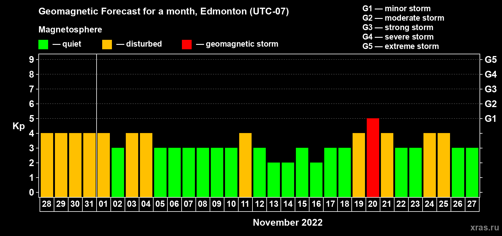 Geomagnetic storm forecast in Edmonton for Oct 28, 2022