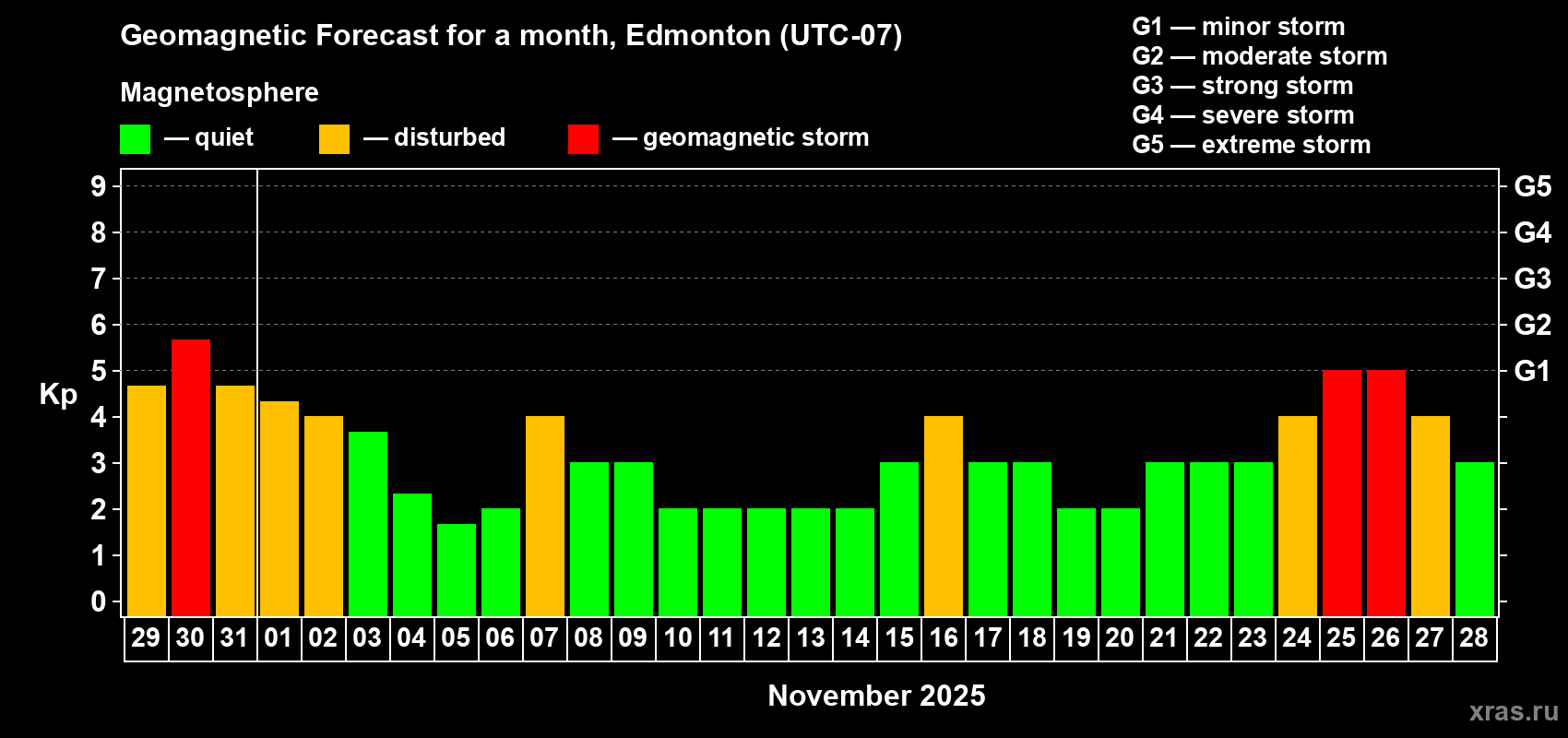 Geomagnetic storm forecast in Edmonton for Oct 29, 2025