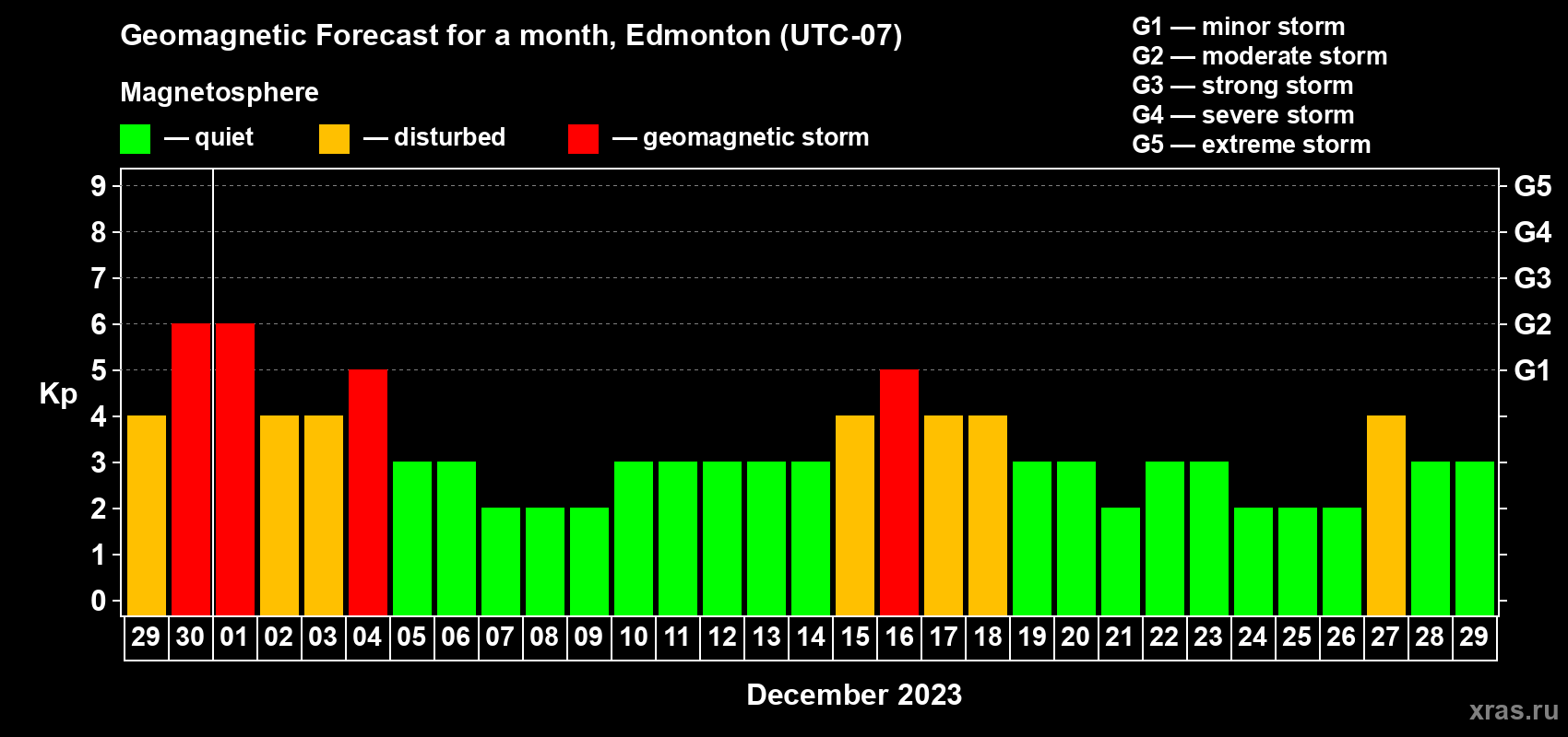 Geomagnetic storm forecast in Edmonton for Nov 29, 2023
