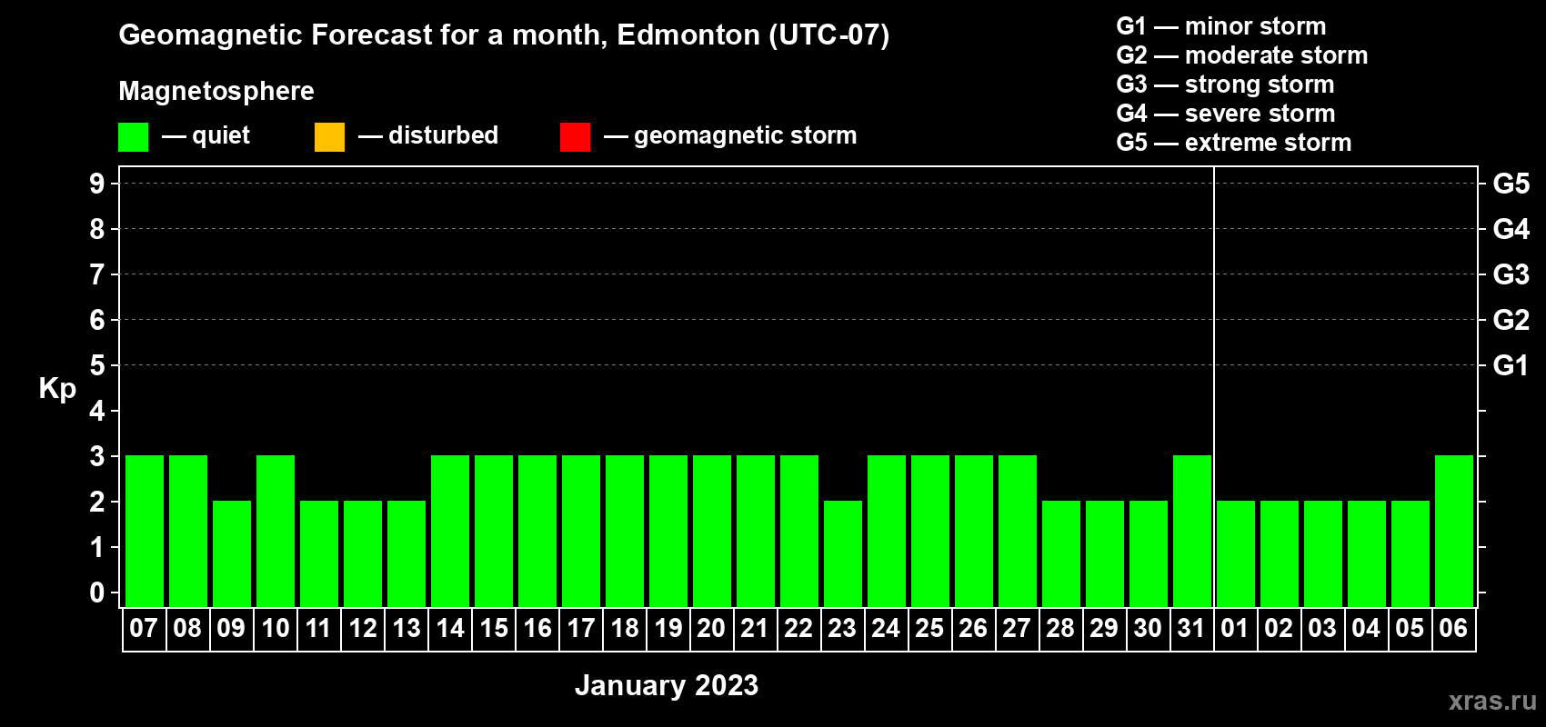 Geomagnetic storm forecast in Edmonton for Jan 07, 2023