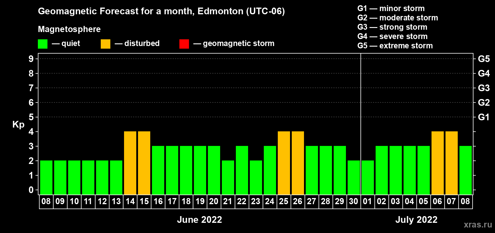 Geomagnetic storm forecast in Edmonton for Jun 08, 2022